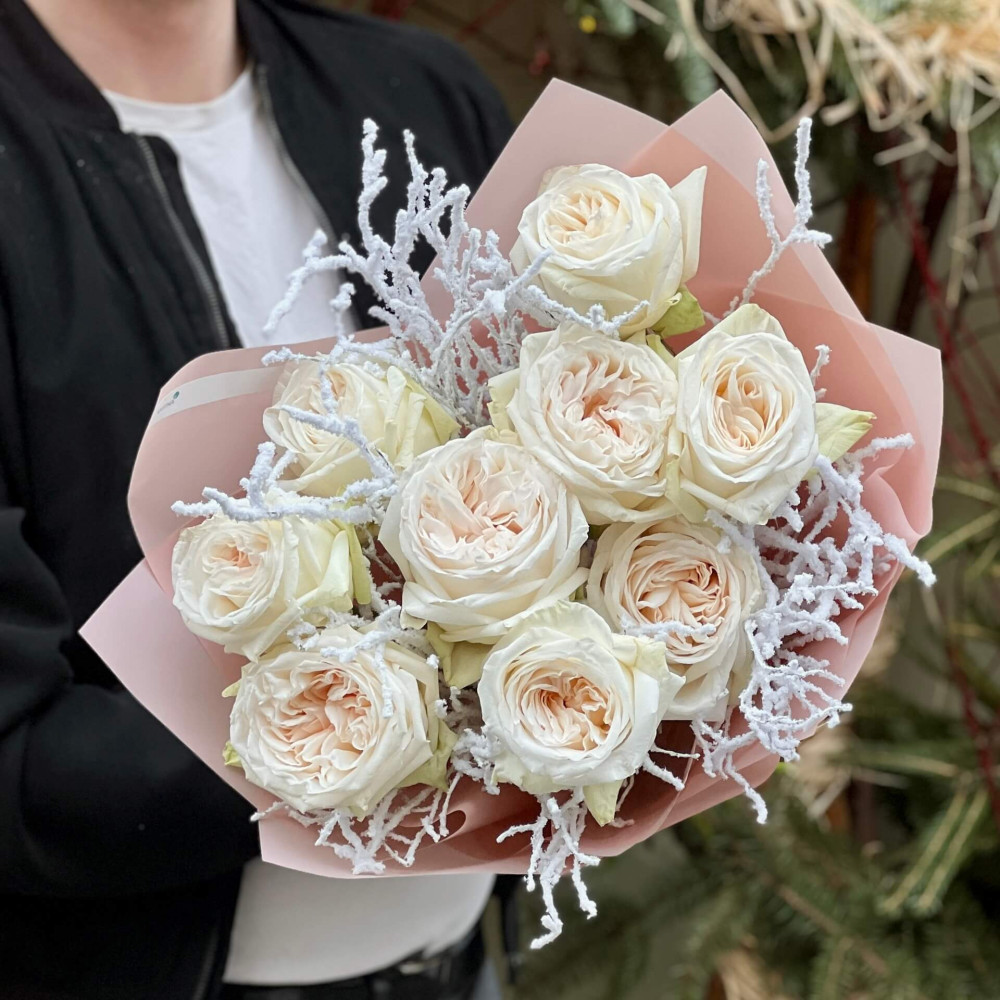- How to order 9 White O'Hara peony roses in a bouquet «Frosty Wind»? ❯