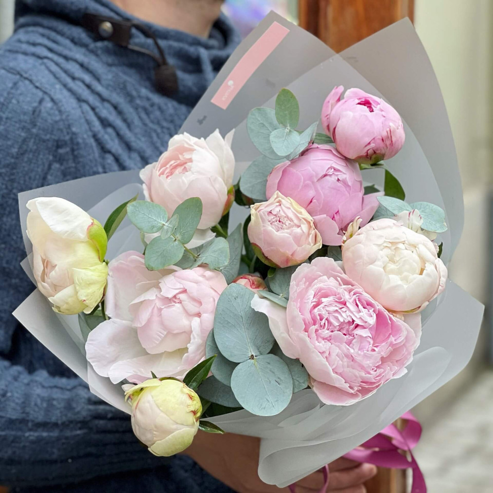 Fragrant peonies will be appreciated by every girl. Luxurious caps of marshmallow-pink flowers with silvery eucalyptus leaves make up a simple and perfect tandem.