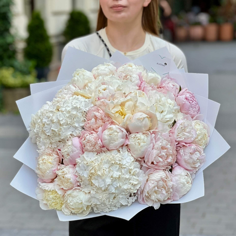Luxurious bouquet featuring two types of flowers: snow-white hydrangeas and powdery peonies. Created in Lviv by Kvitna team florist Petro Babiy in 2025. Price range — premium.