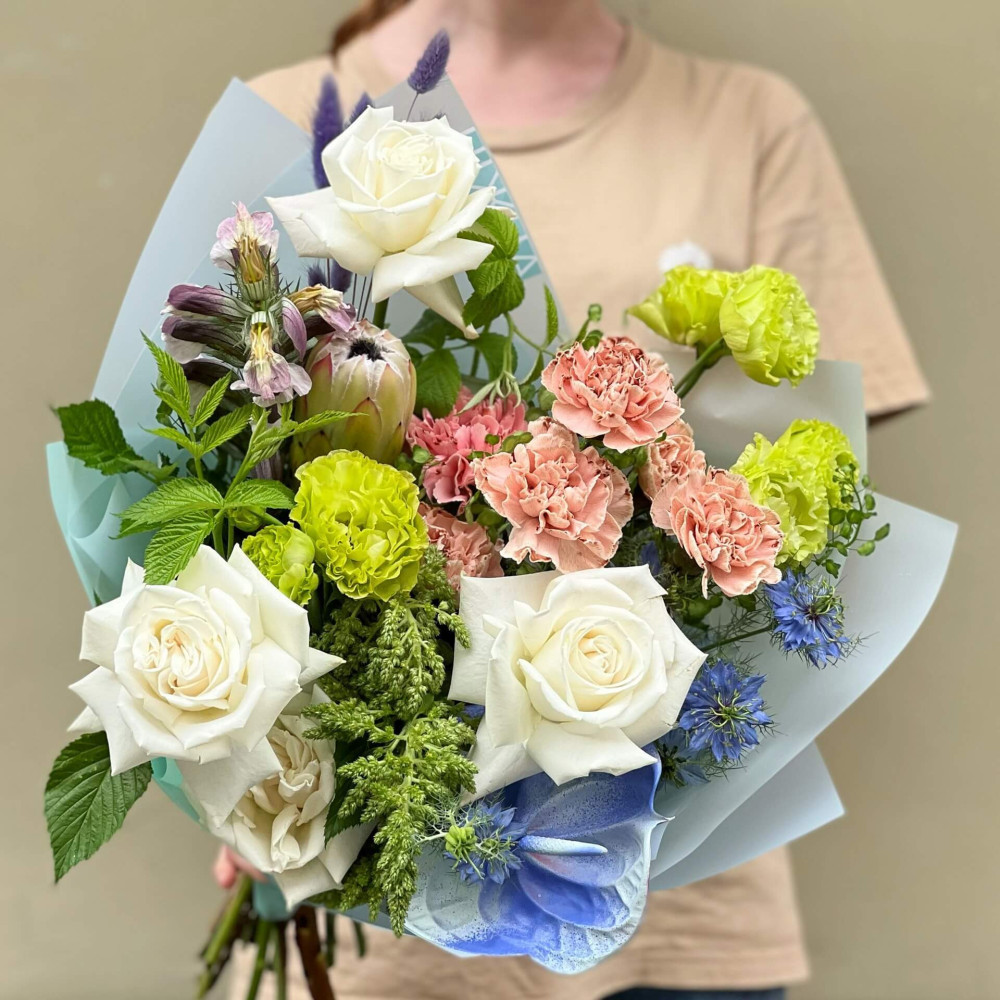 Flowers: Rose, Dianthus, Anthurium, Eustoma, Protea, Nigella