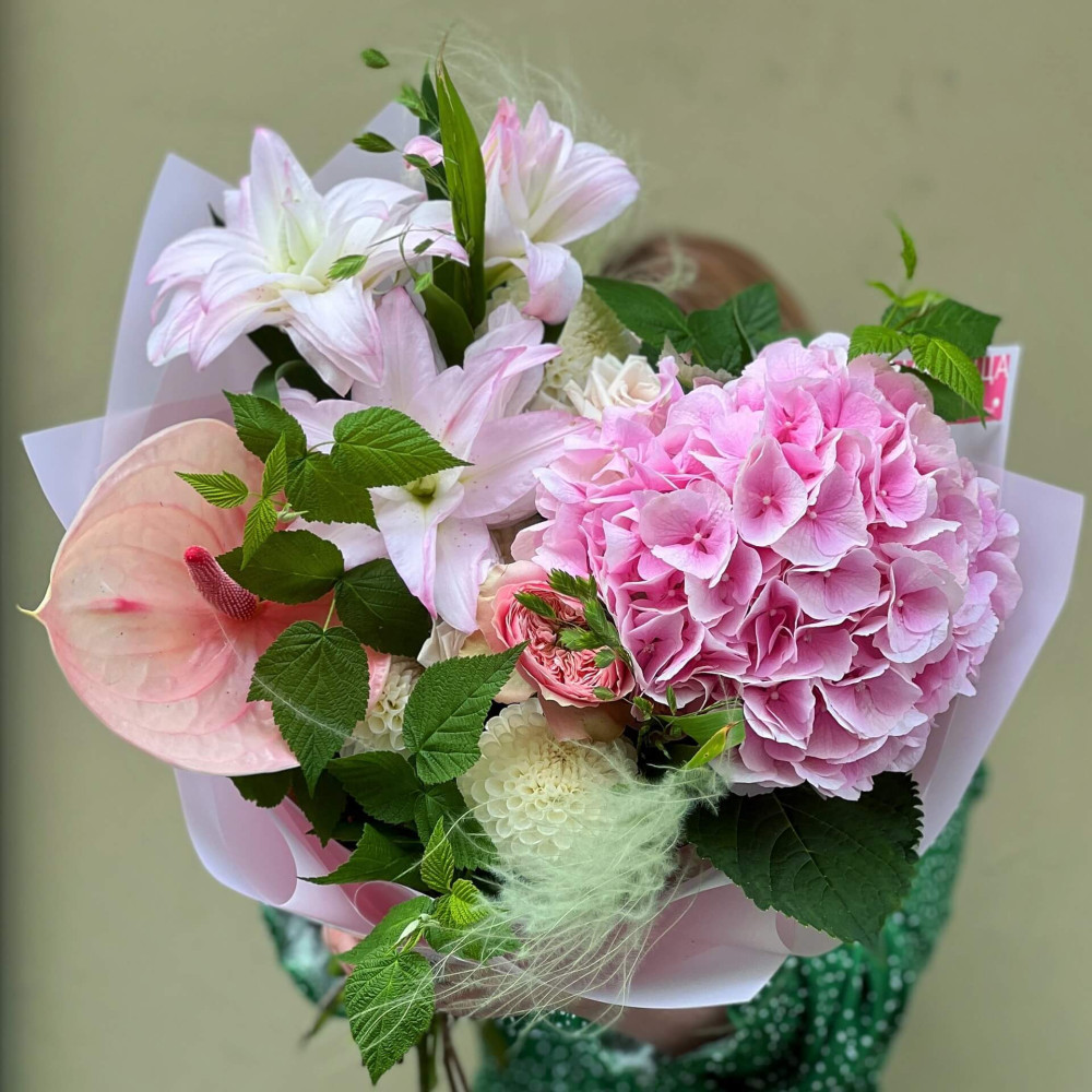 Flowers: Hydrangea, Anthurium, Lilium, Pion-shaped rose, Dahlia