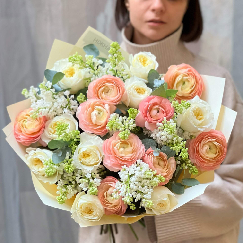 Flowers: Ranunculus, Pion-shaped rose, Syringa, Eucalyptus
