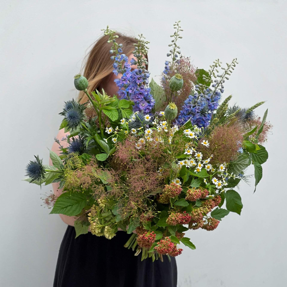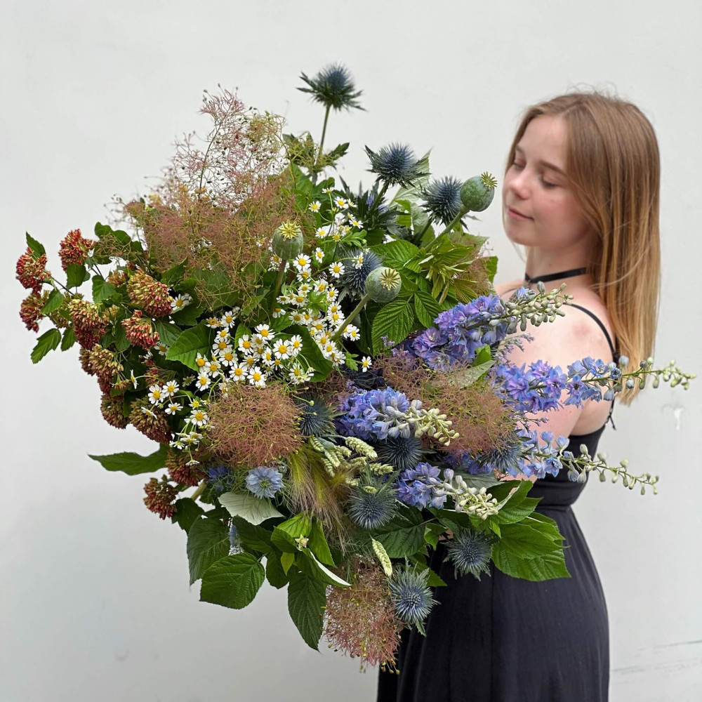 Flowers: Delphinium, Eryngium, Tanacetum, Papaverum, Cotinus, Raspberry twigs