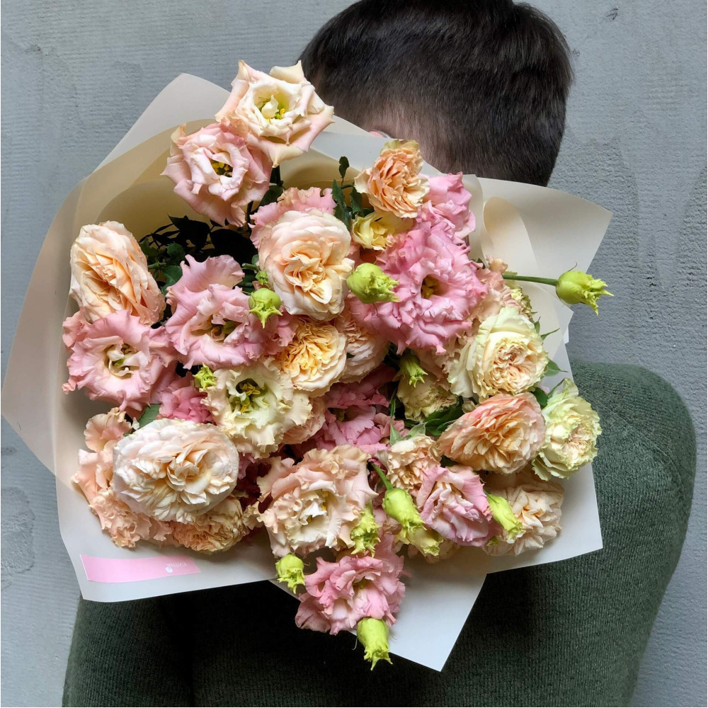 - How to order Lacy bouquet of spray peony roses and eustomas «Warm Dawn»? ❯