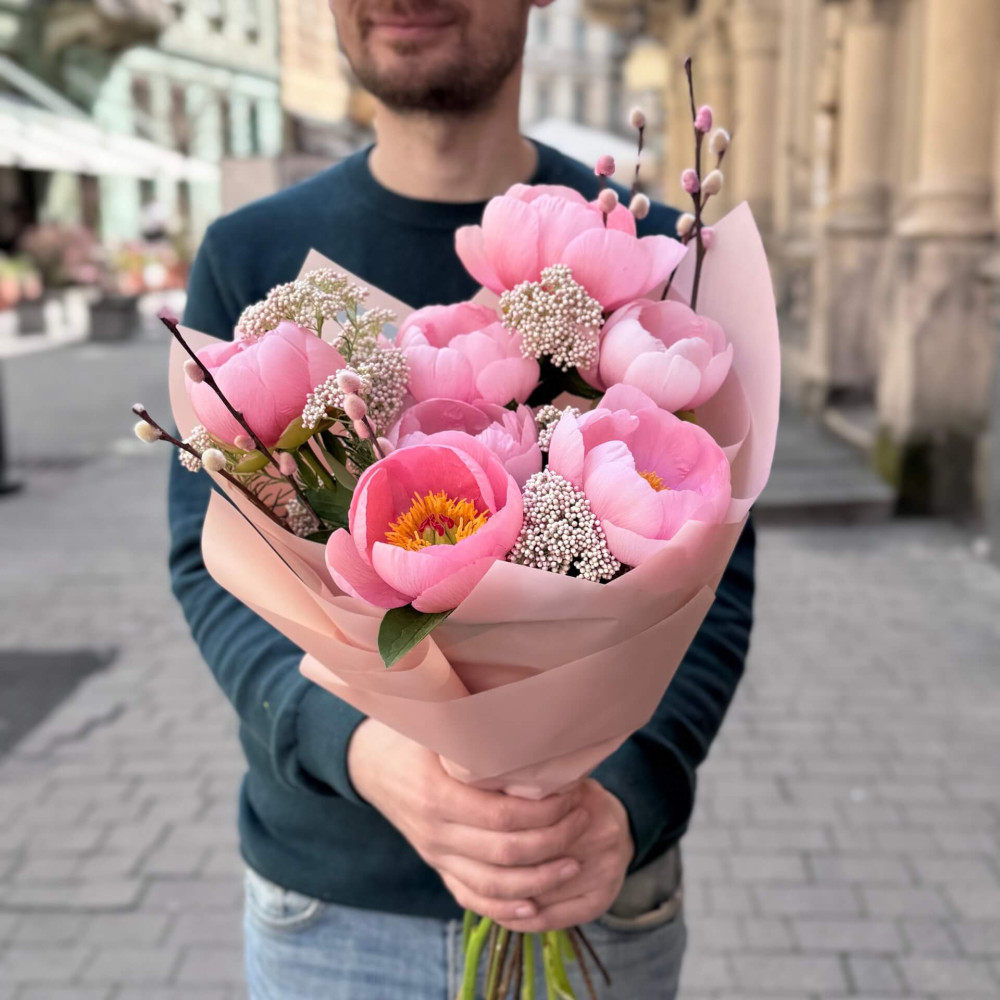- How to order Delicate bouquet of 7 Salmon Dream pink peonies «Luxurious Necklace»? ❯