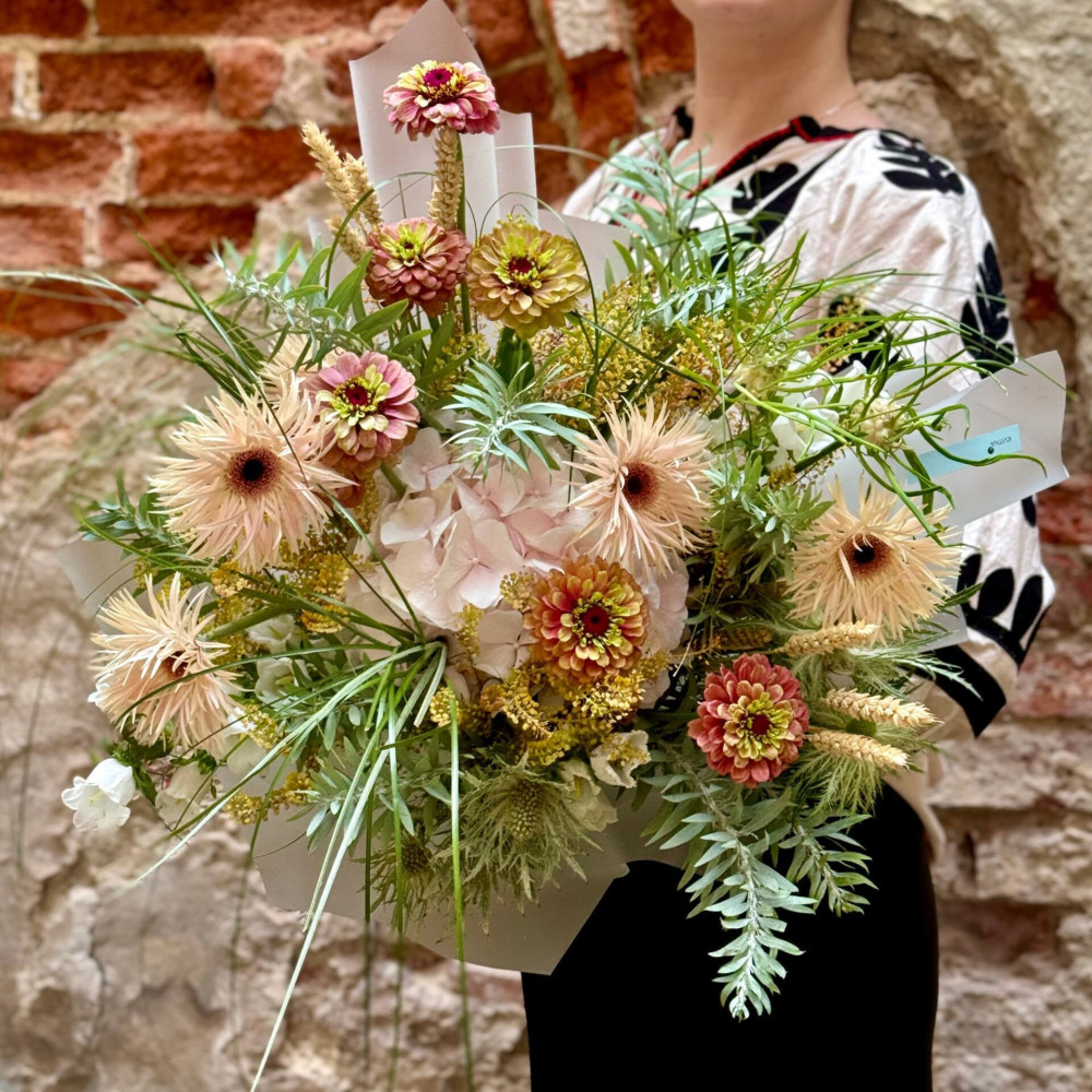 Flowers: Zinnia, Gerbera, Hydrangea, Bergras, Eryngium, Wheat, Olive