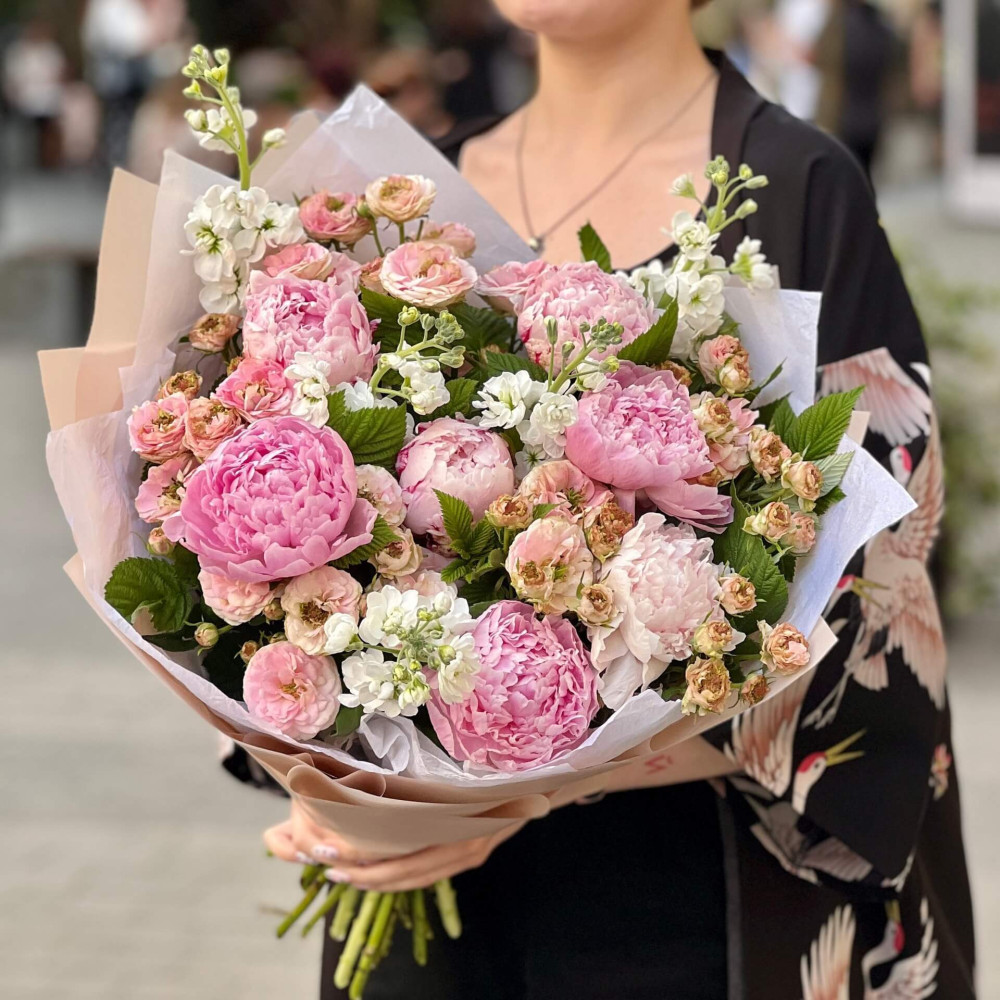 - How to order Fluffy bouquet with peonies and matthiola «Raspberry Atlas»? ❯
