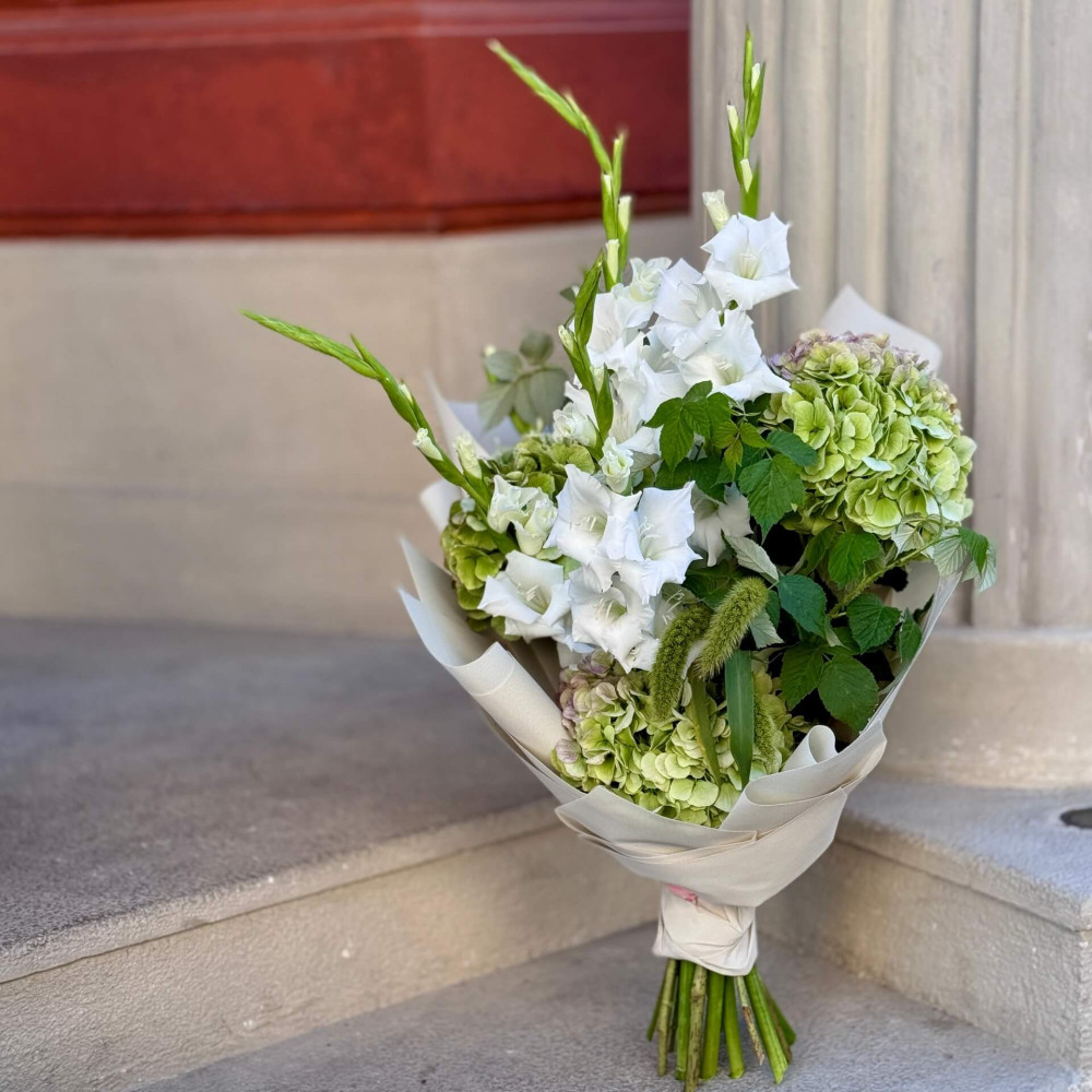 - How to order Fluffy bouquet with gladiolus in white and green shades «Verdant Topaz»? ❯
