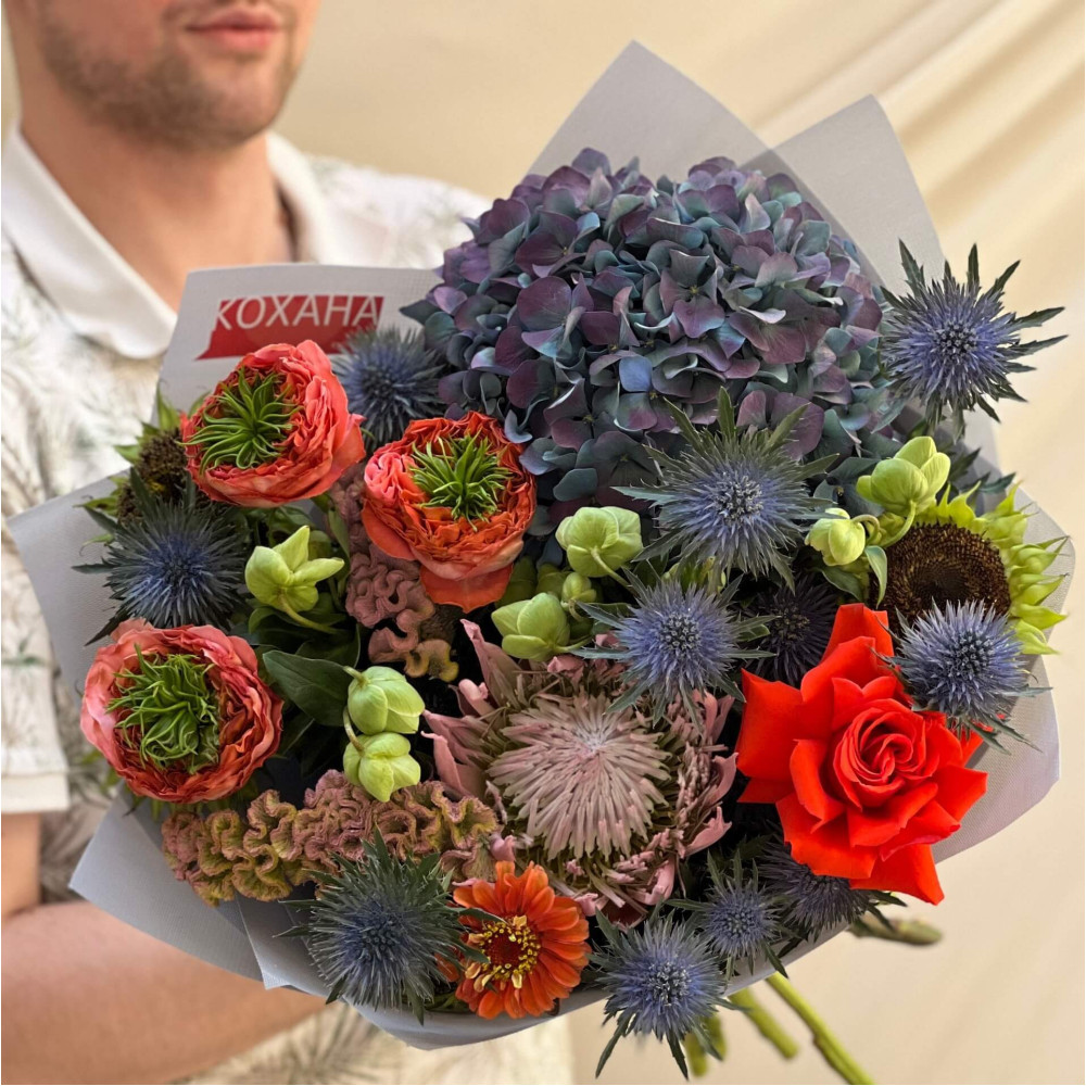Flowers: Helianthus, Helleborus, Rose, Pion-shaped rose, Eryngium, Protea, Zinnia, Hydrangea, Celosia