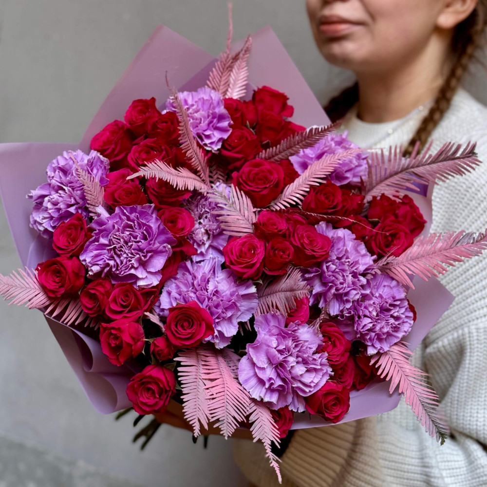 - How to order Bright bouquet with dianthus and spray roses «Interesting Accent»? ❯