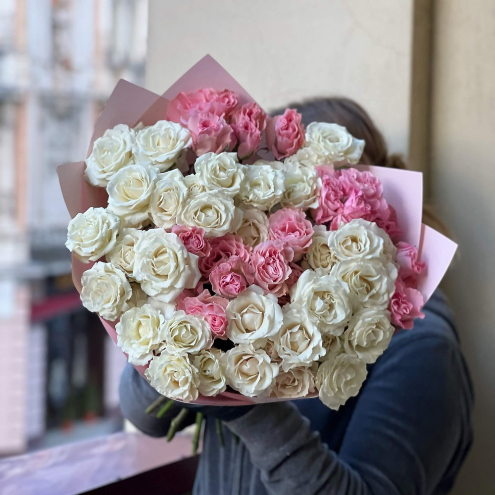 Одні з найніжніших та найжіночніших кольорів це білий та рожевий. Найжіночніша квітка - це троянда. І коли це все поєднати, на світ з‘являюсь я - вишуканий букет для найніжнішої жінки на планеті.