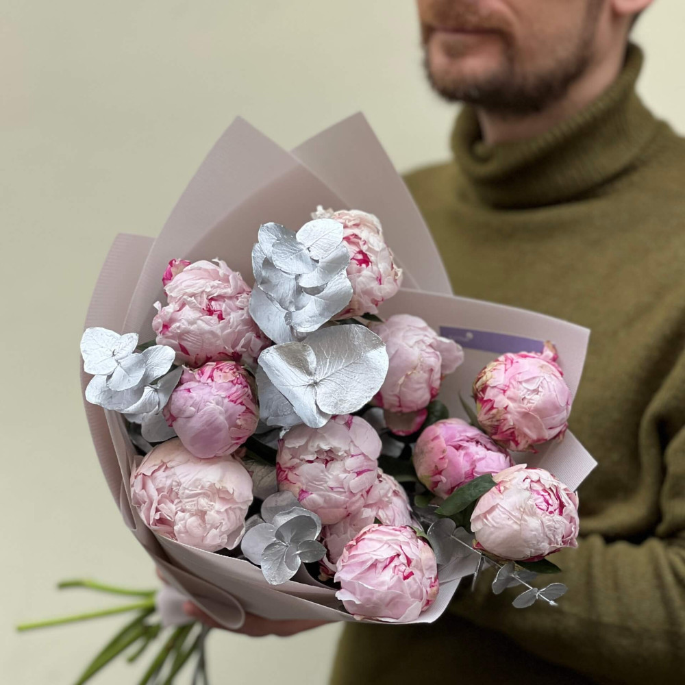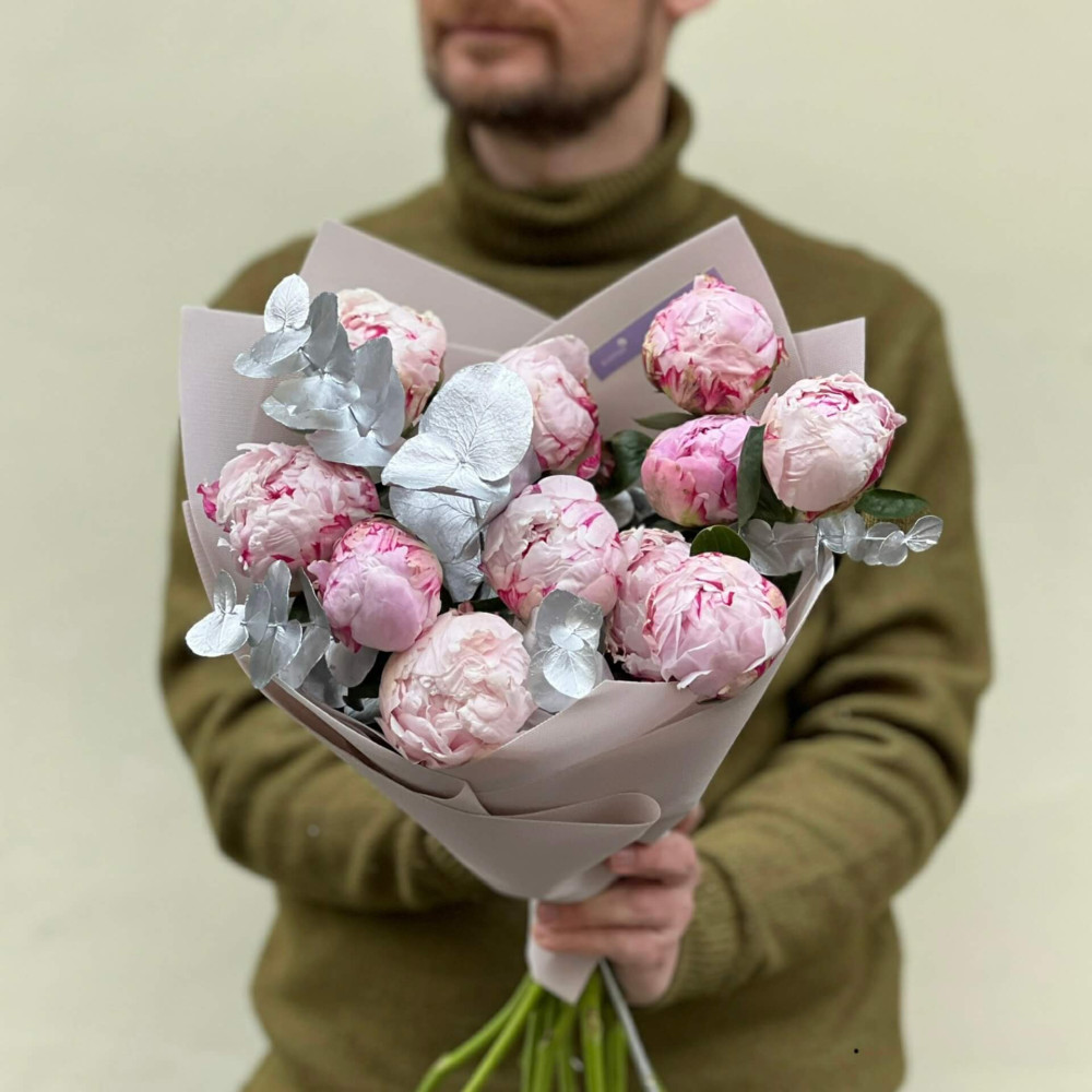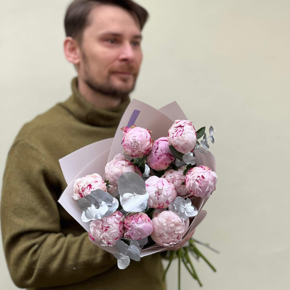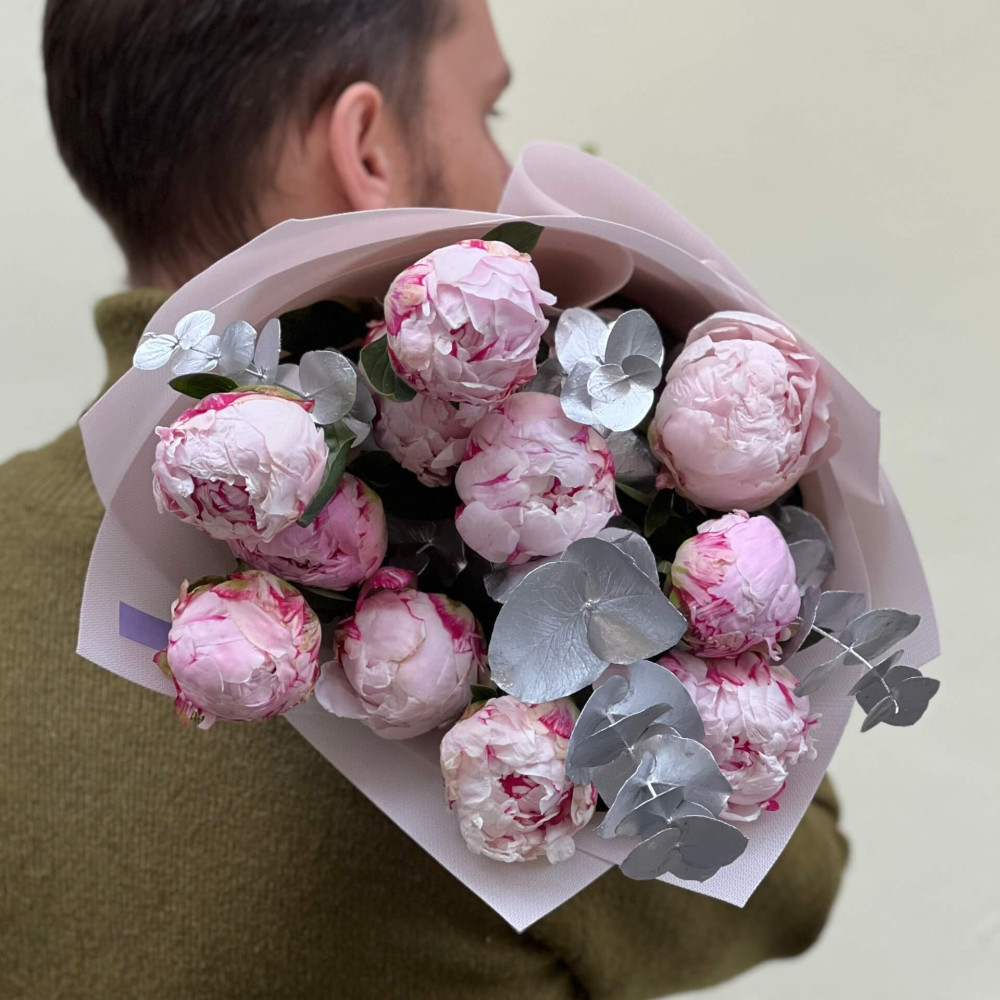 - Як замовити 11 рожевих півоній Sarah Bernhardt та евкаліпт у букеті «Морозний дотик»? ❯