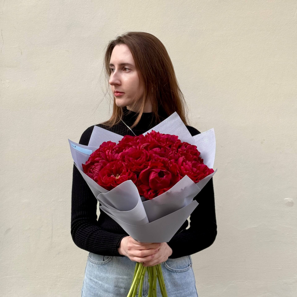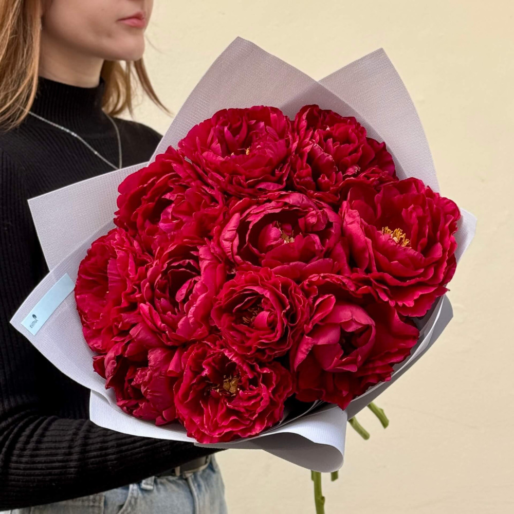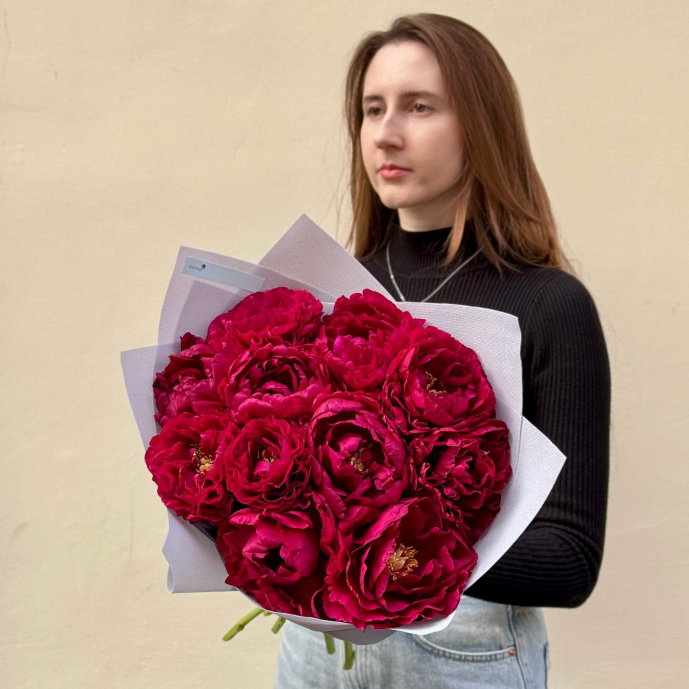 - Як замовити 11 розкішних бордових півоній сорту Old Faithful у букеті «Рубінова магія»? ❯