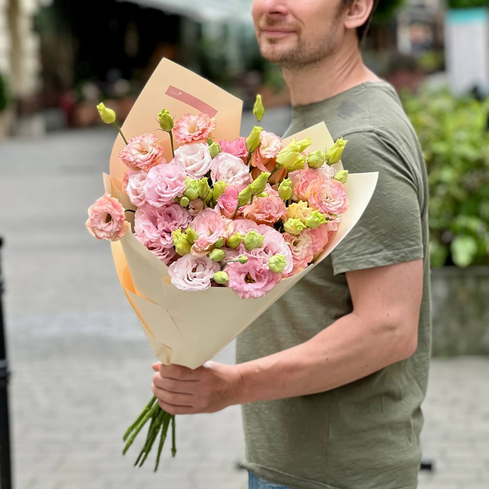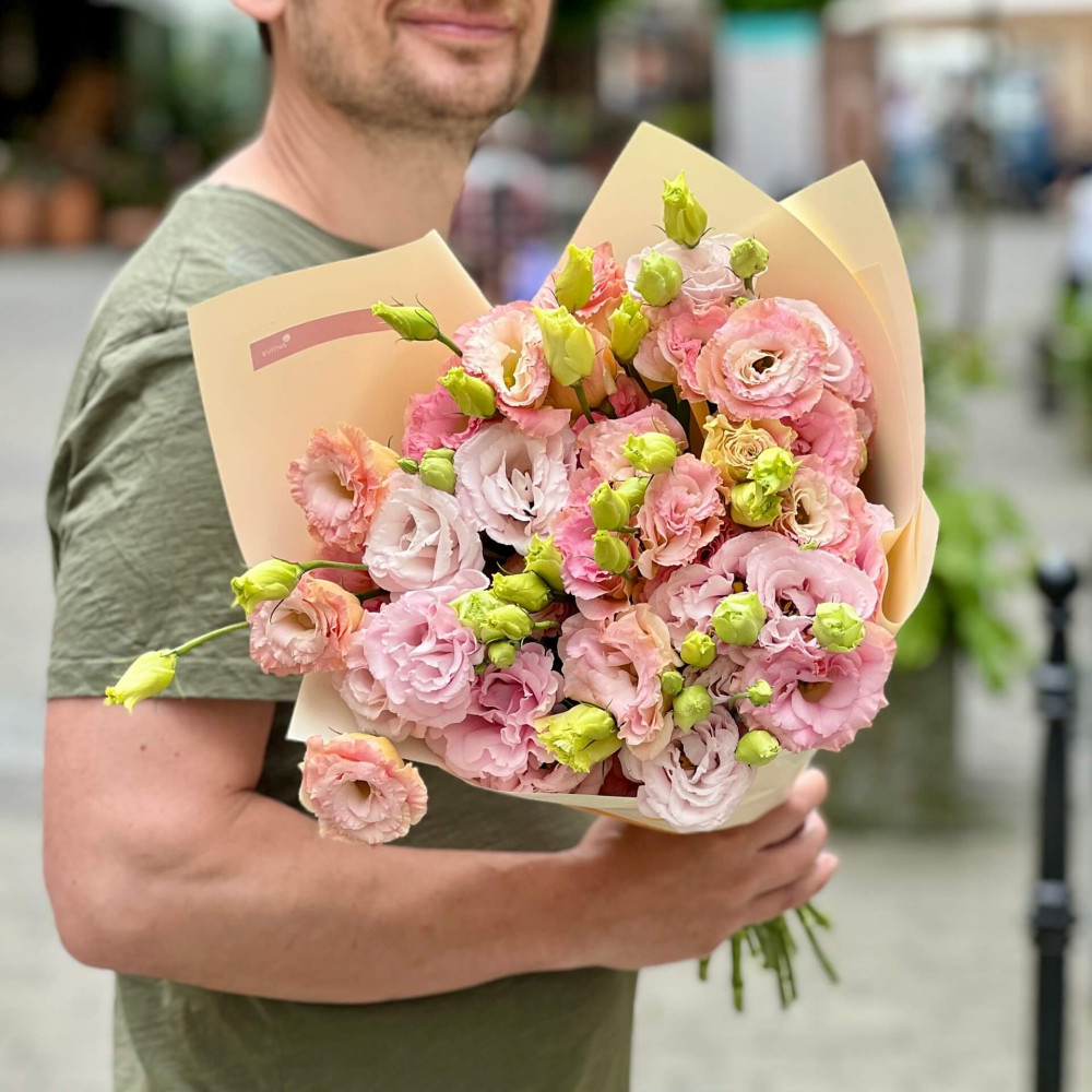 - Як замовити 13 гілок еустоми у букеті «Персикова хвиля»? ❯