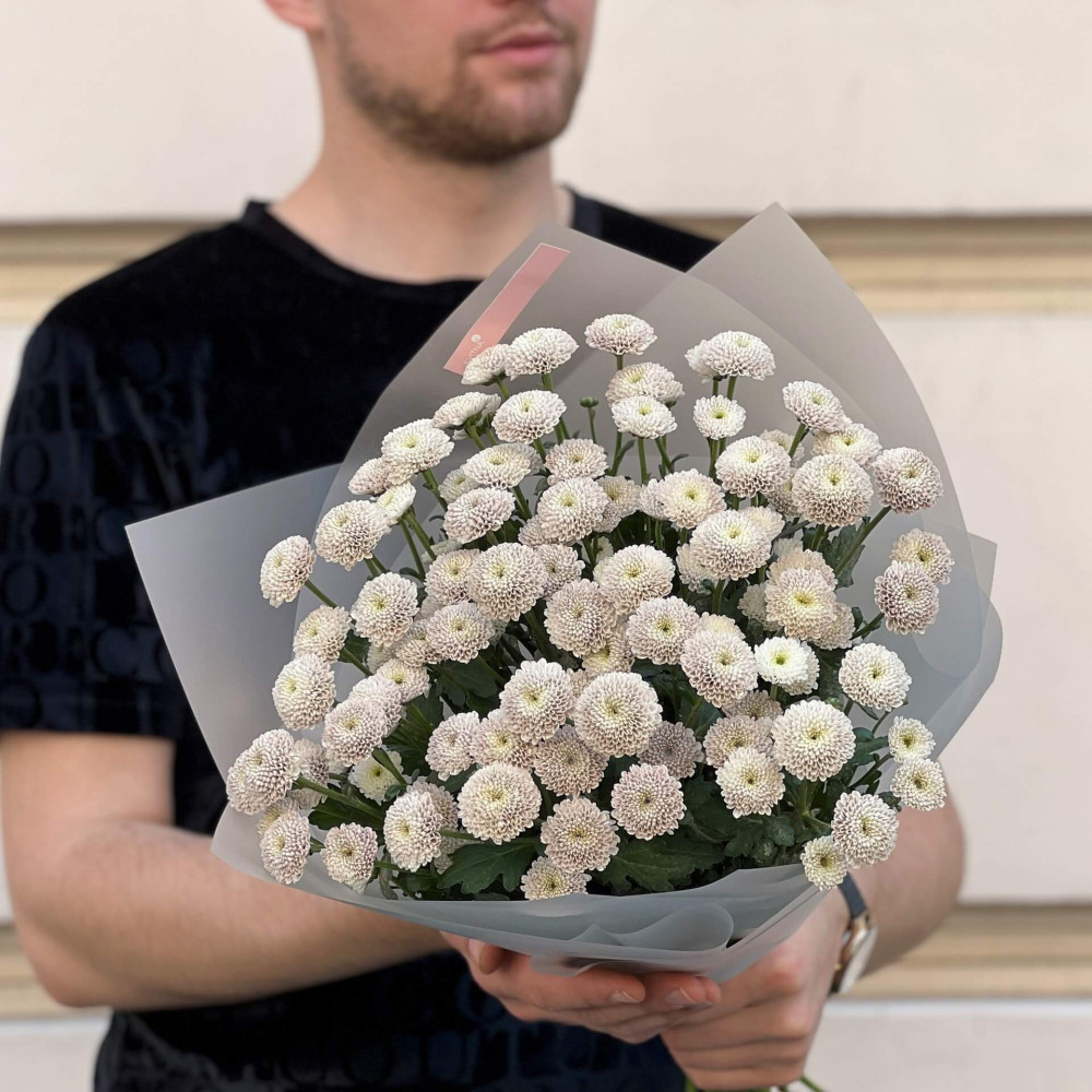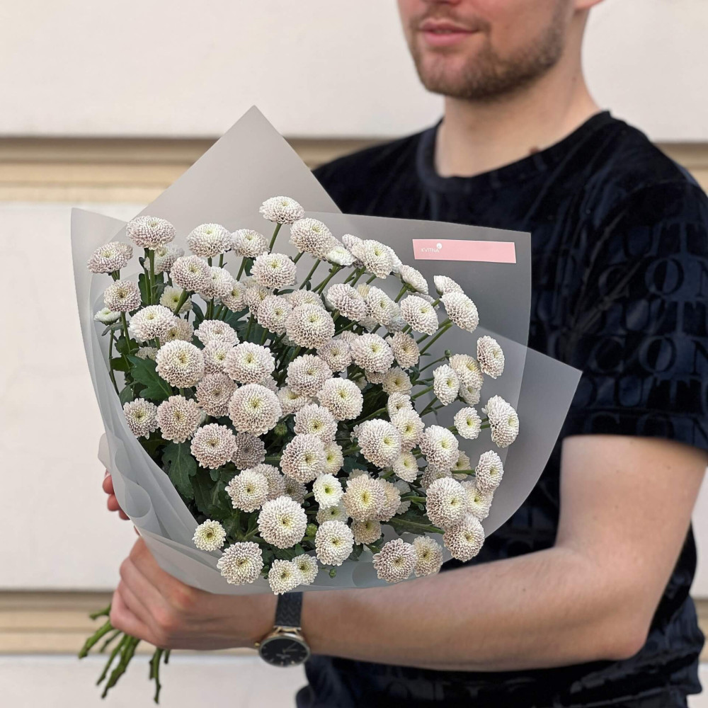 - Як замовити 13 кущових хризантем у букеті «Молочний брауні»? ❯