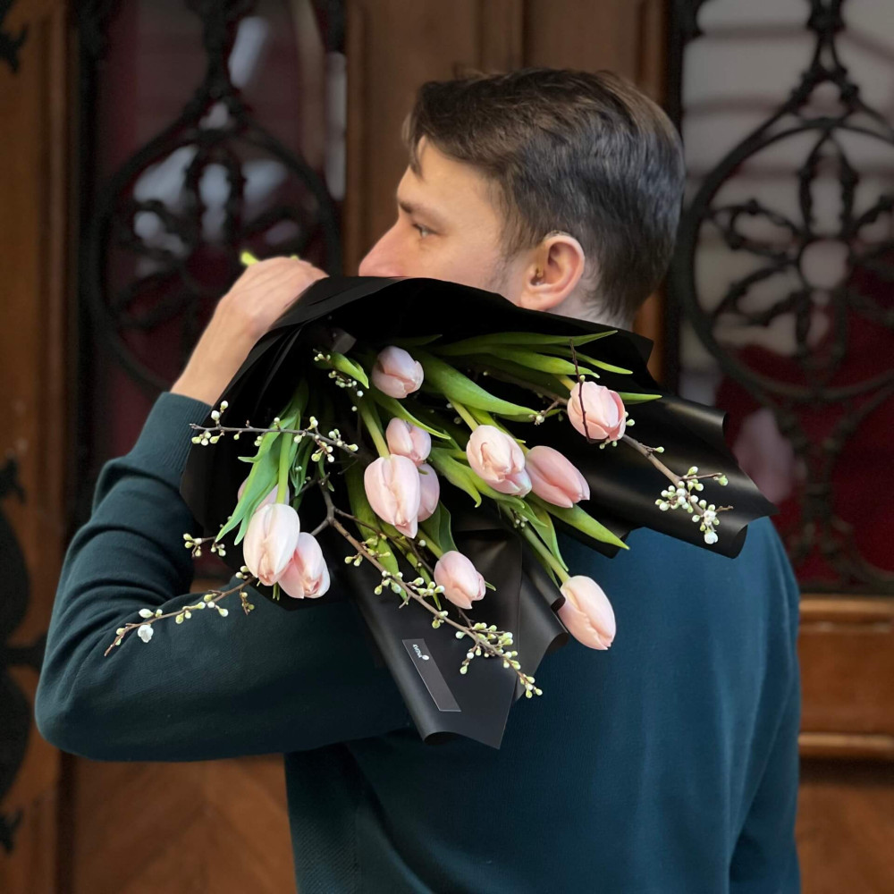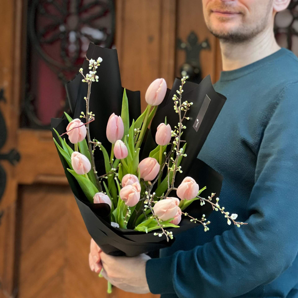 - Ми радимо знімати упаковку з букета і ставити букет в вазу в тій спіральній техніці, яку зробив флорист, тоді букет буде тримати гарну форму і тюльпан дасть свій природній вигин і красиве розкриття.