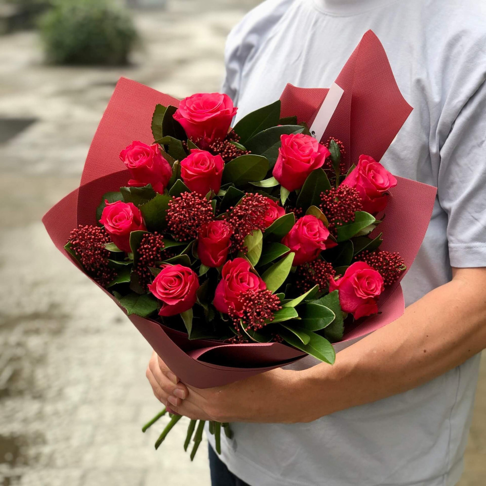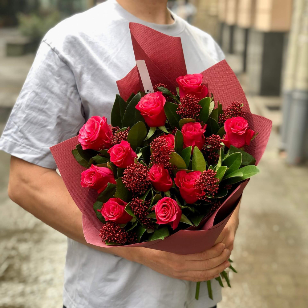 - Як замовити 13 троянд Tacazzi та скімія у букеті «Гранатова карамель»? ❯