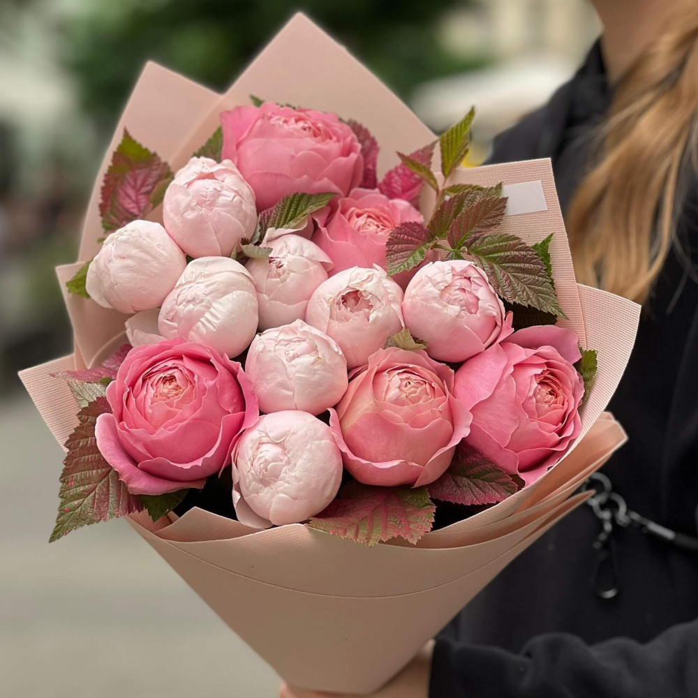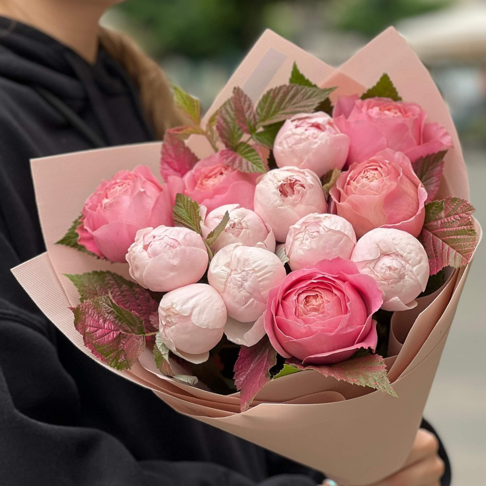 Квіти: Малина (листя), Троянда піоновидна - 13 шт.