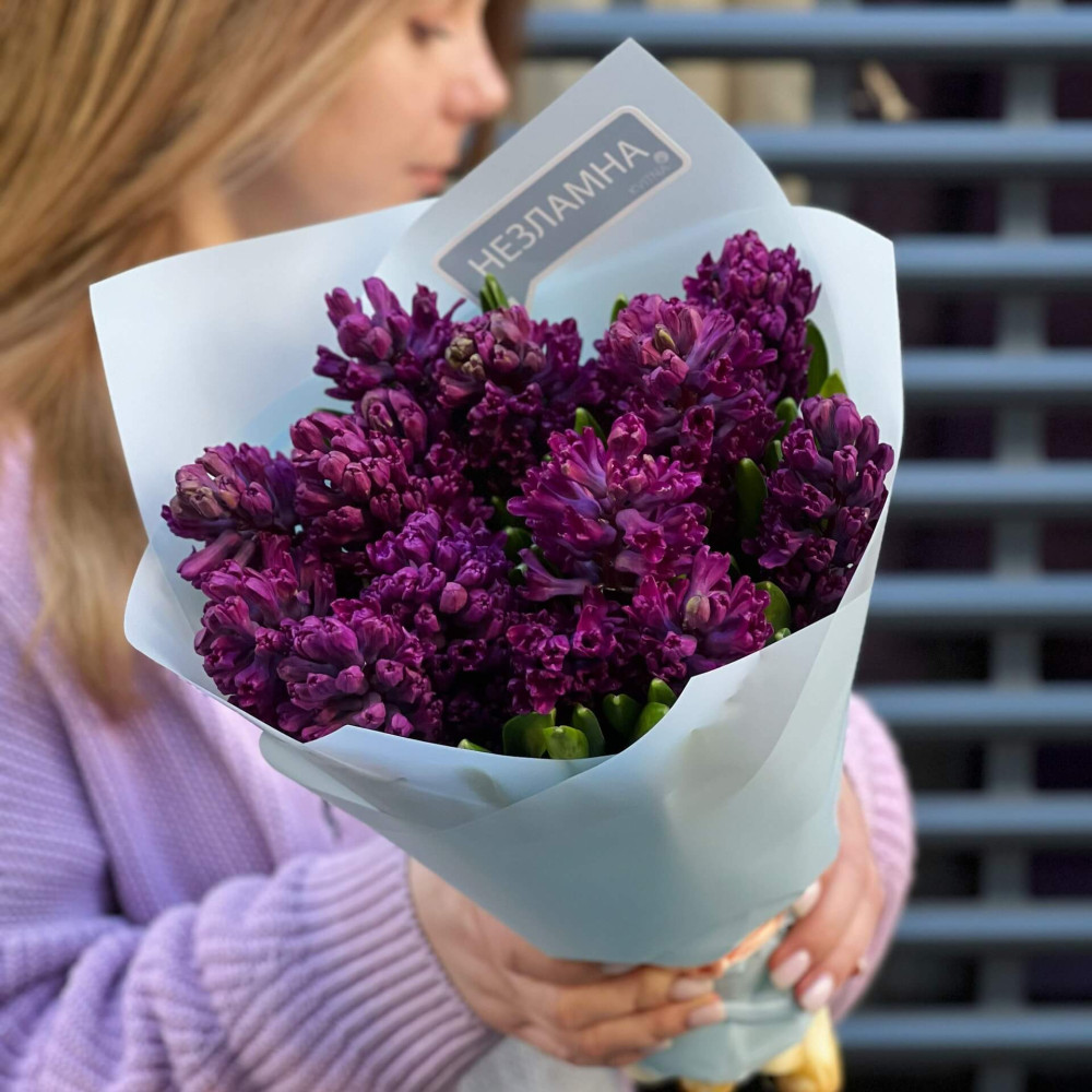 - Як замовити 15 фіолетових гіацинтів у букеті «Весняний баклажанчик»? ❯
