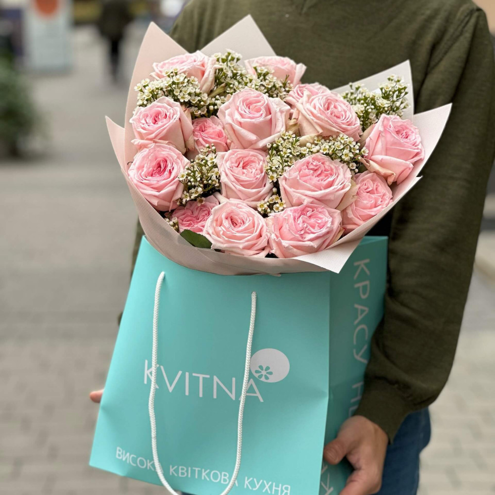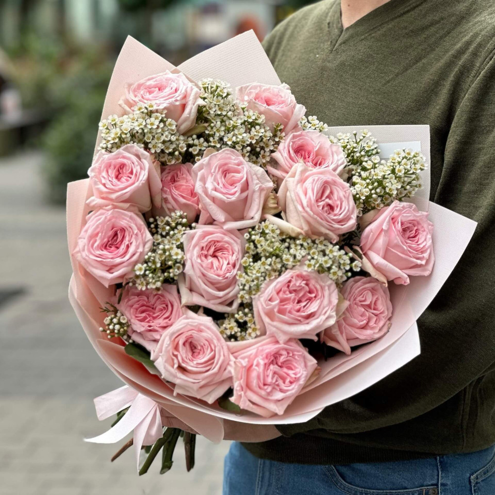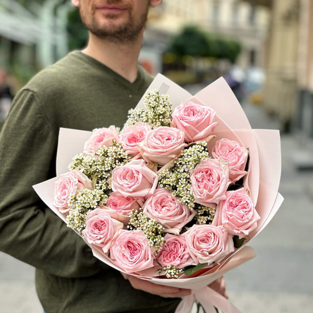 - Як замовити 15 пионовидних троянд та хамелаціум у букеті «Запашна краса»? ❯