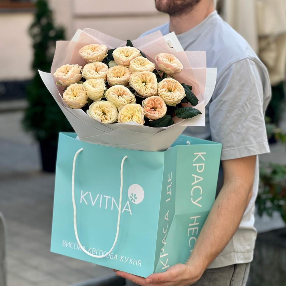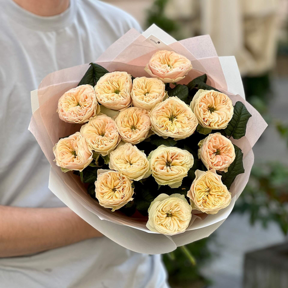 - Як замовити 15 піоновидних троянд Stanley Abbey у букеті «Крем Брюле»? ❯