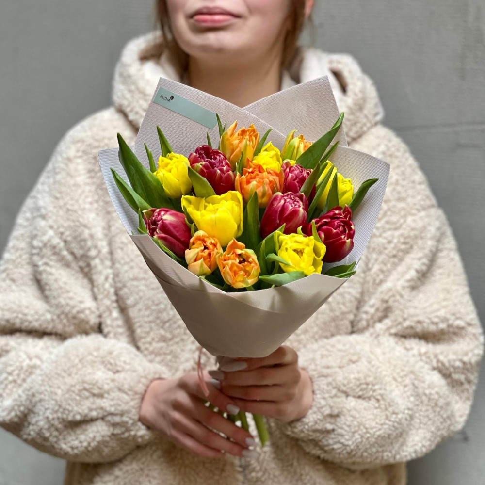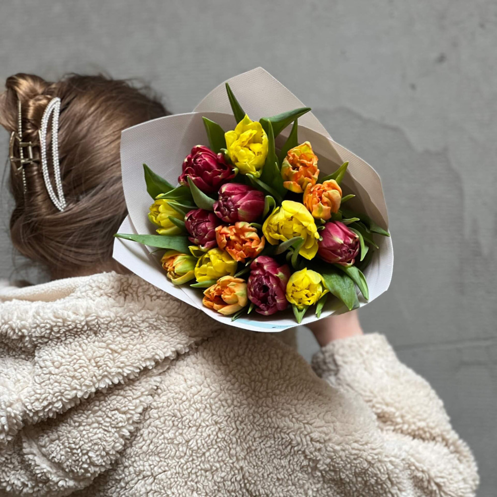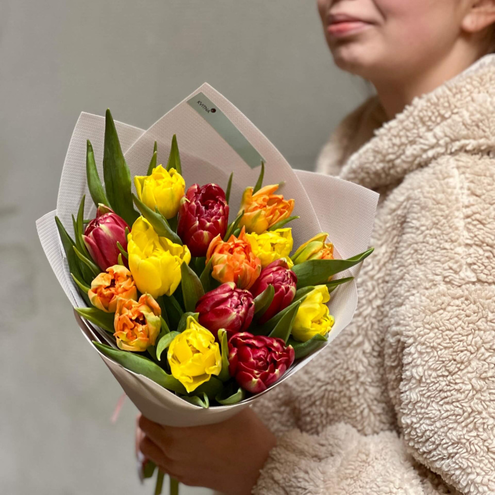 - Як замовити 15 піоновидних тюльпанів у букеті «Палаючий світанок»? ❯