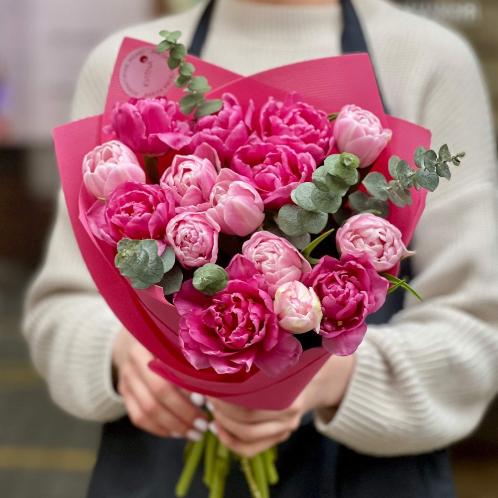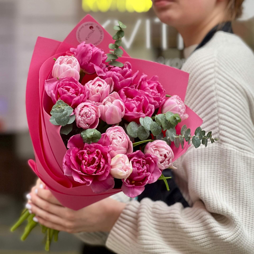 - Як замовити 15 піоновидних тюльпанів у букеті «Весняна малинка»? ❯