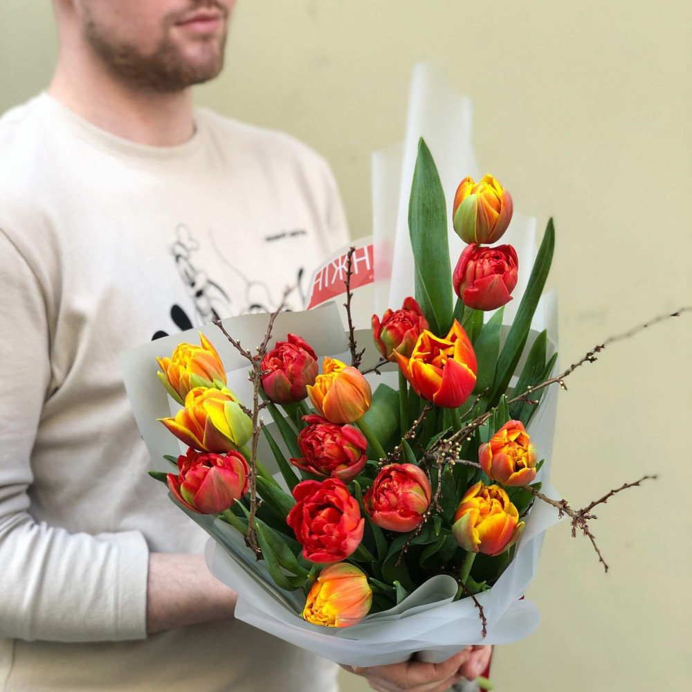 Я - яскравенький букет з пишногрудими піоновидними тюльпанами! В мені заховані весняна свіжість та справжній аромат тепла.