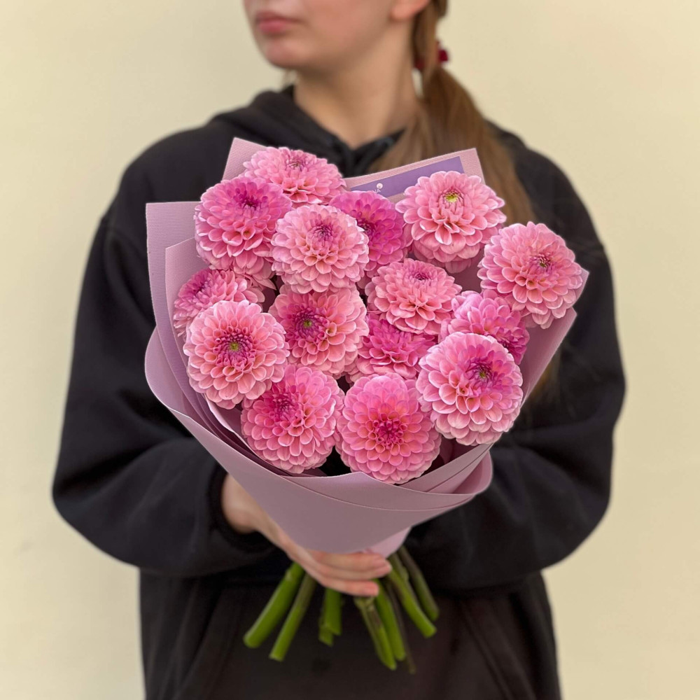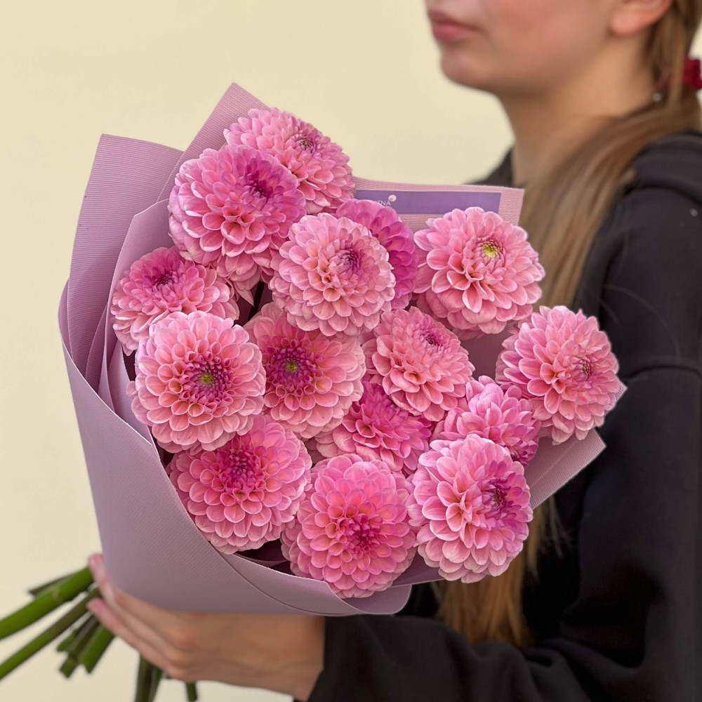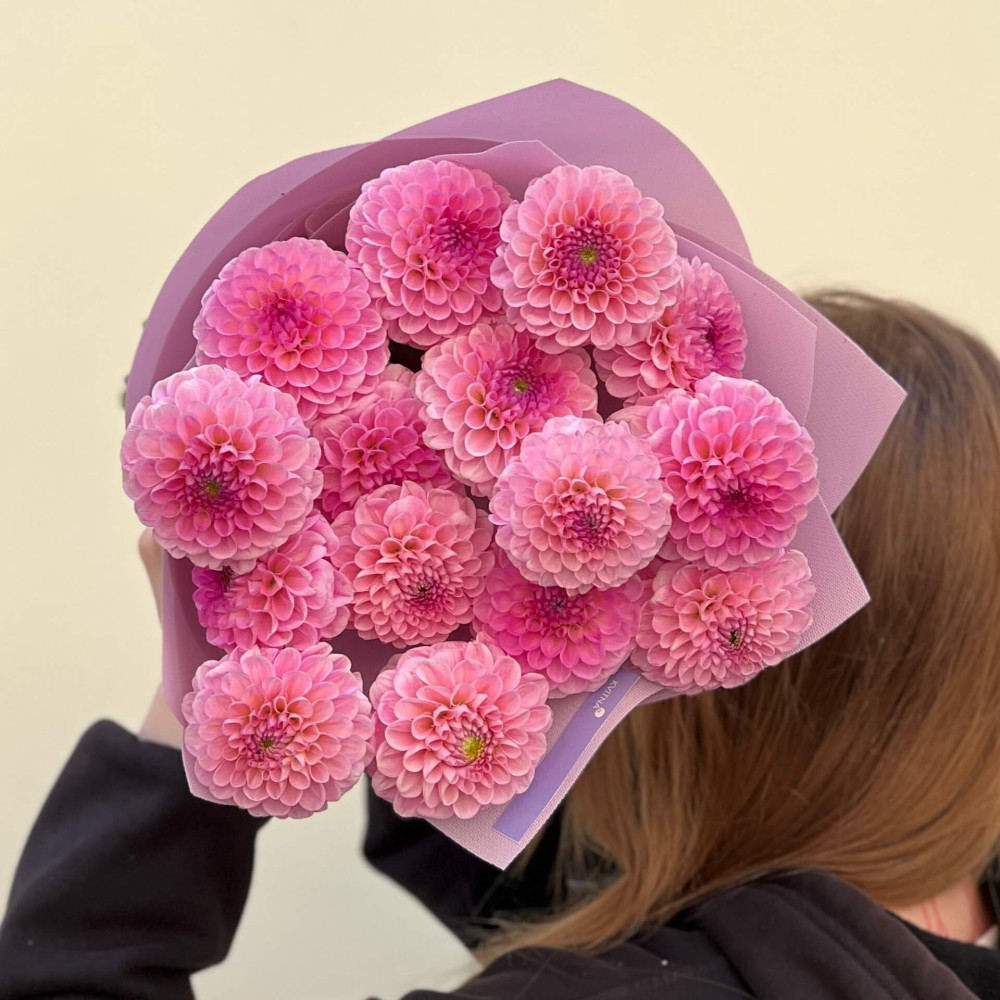- Як замовити 15 рожевих жоржин у букеті «Бурхливі цьомчики»? ❯