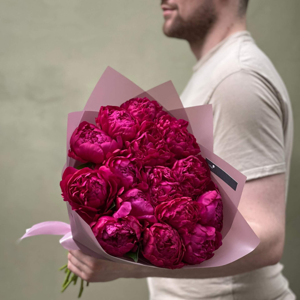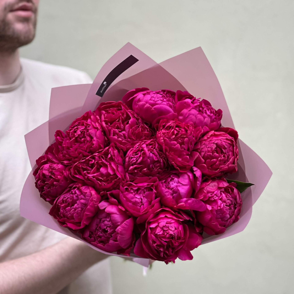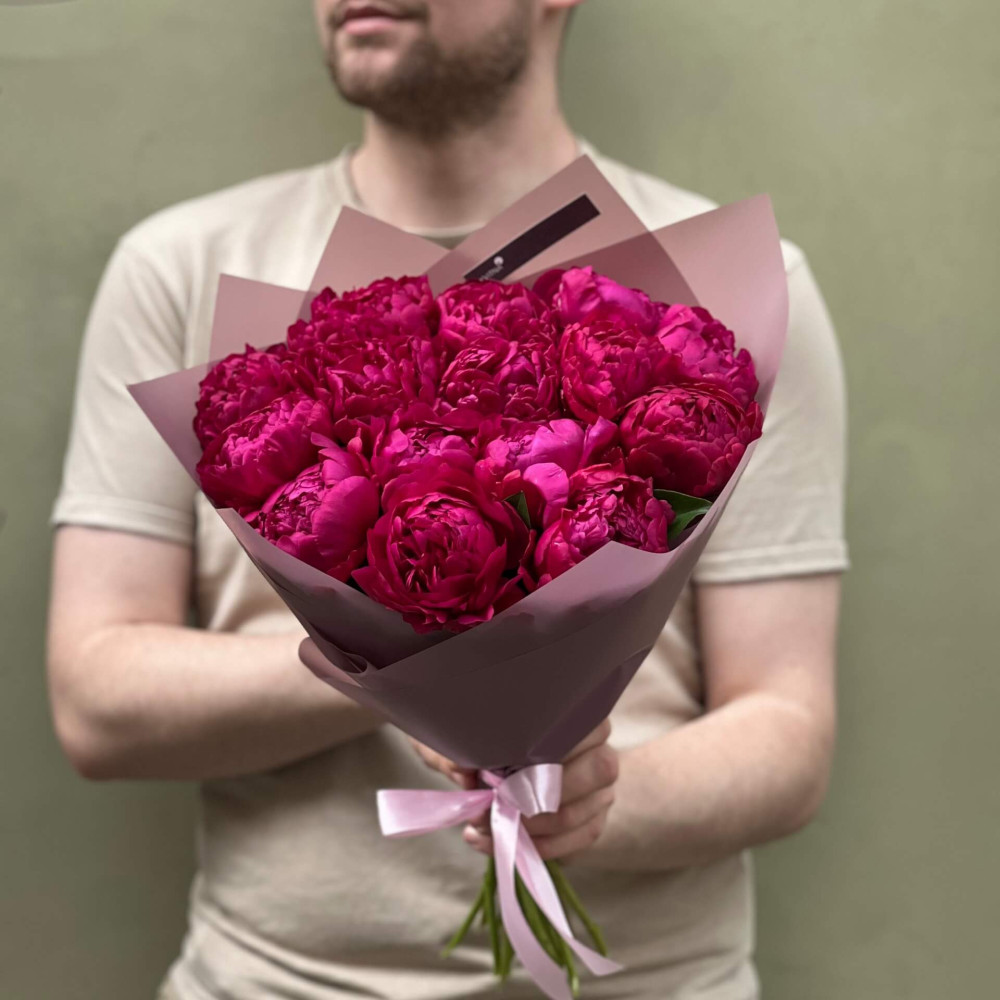 - Як замовити 15 темно-малинових півоній у букеті «Ожиновий сік»? ❯