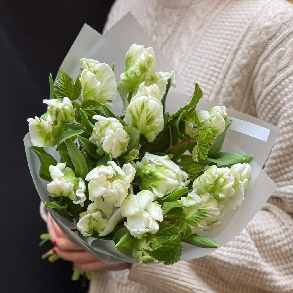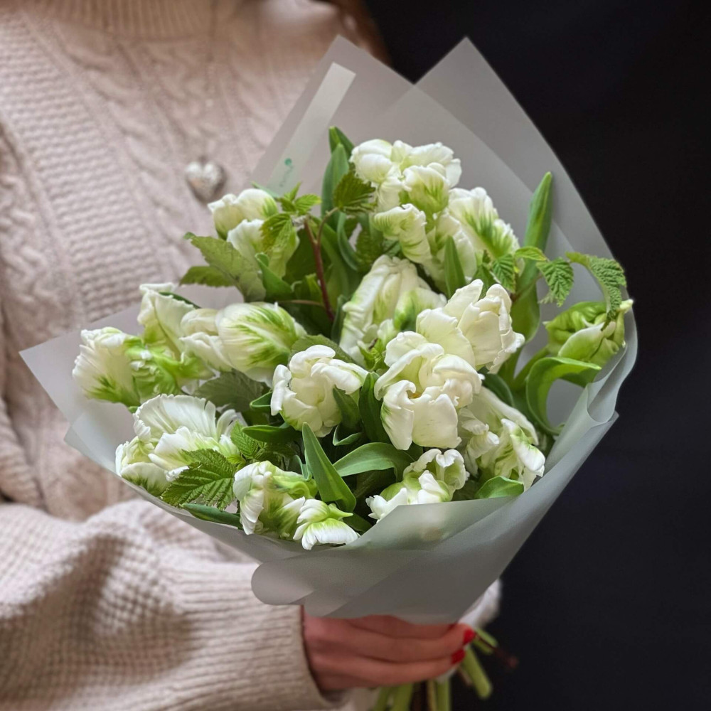 Соковиті хрумкі зеленувато-білі тюльпани з пелюстками подібними на барвисті пір'їни в обрамленні зелені малини. Пташка, яка хоче прилетіти до тебе і тішити своєю красою.