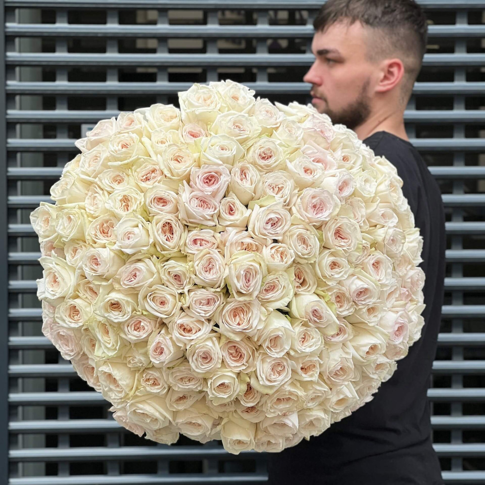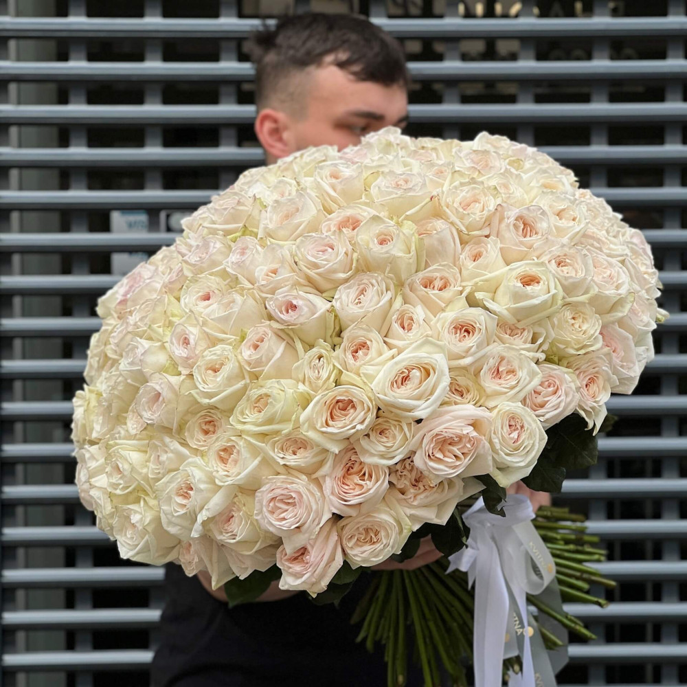 Букет зі 151 запашної троянди сорту Вайт О'Хара створений, щоб вражати. Немовби кажучи: я ще не дістану тобі зірки з неба, бо Ілон Маск ще не винайшов гіперзвукові двигуни, проте я встелю твій шлях квітами і огорну тебе щастям!