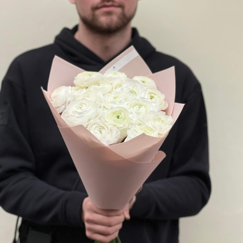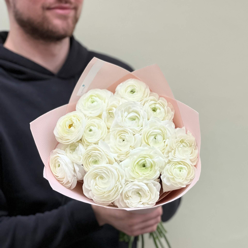 - Як замовити 17 білих ранункулюсів Blanco у букеті «Солодкі зефірки»? ❯