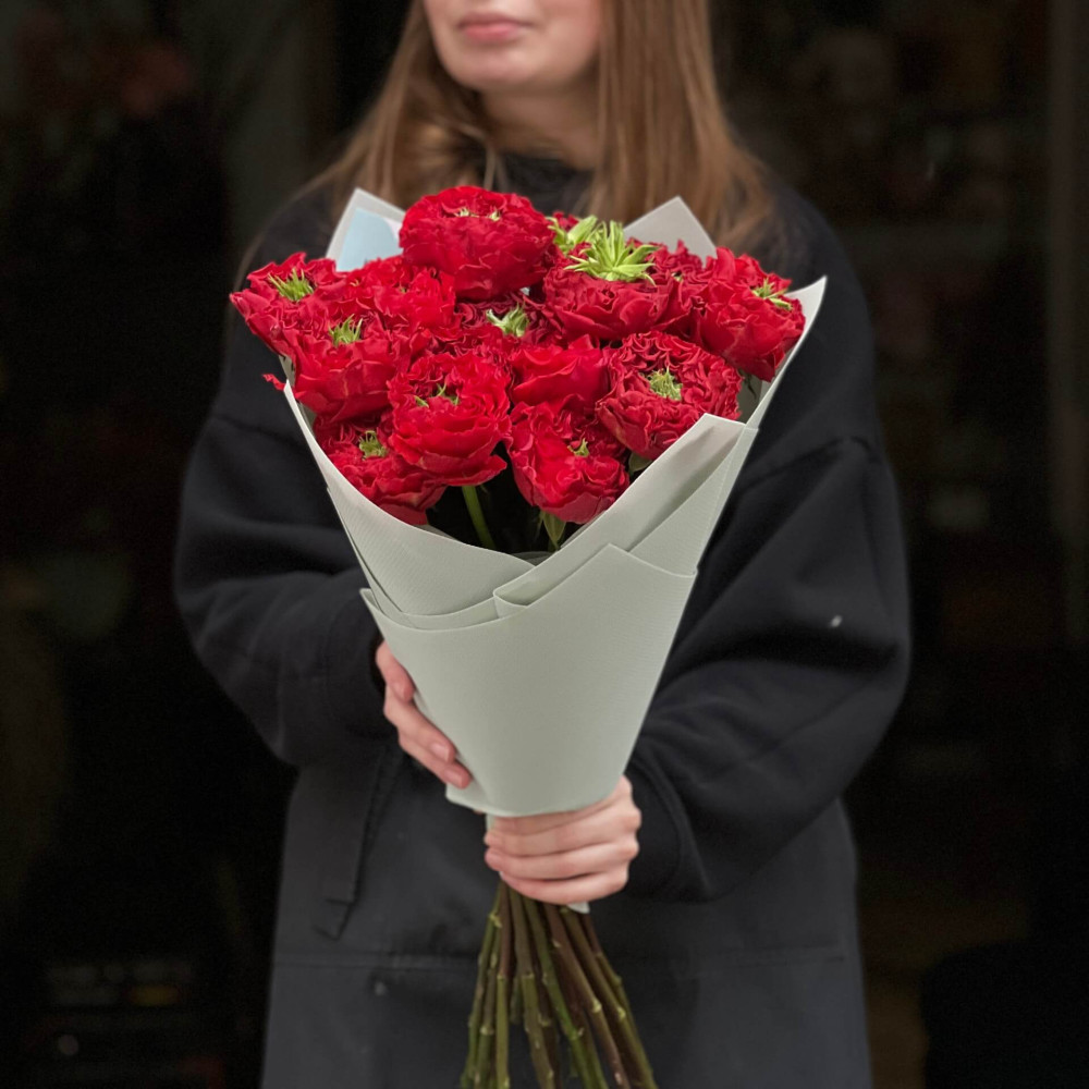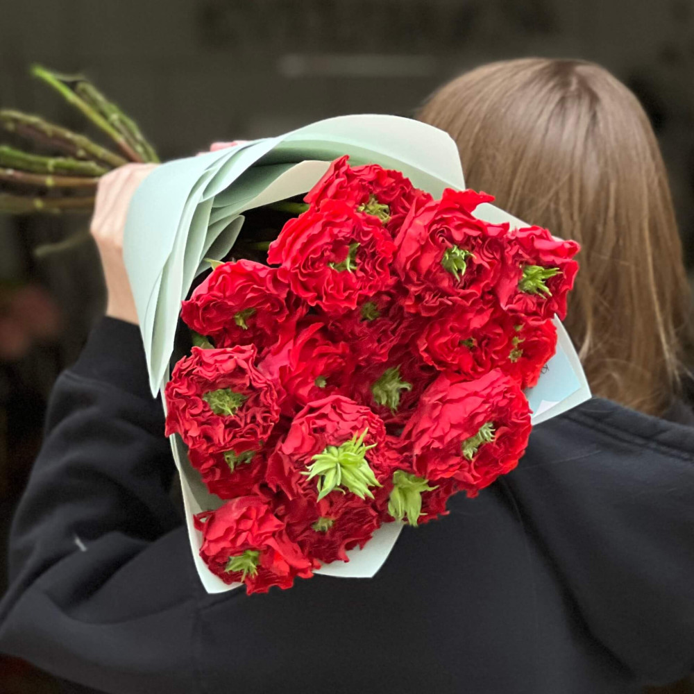 - Як замовити 17 незвичайних півонієвидних троянд Red Monster у букеті «Заквітчаний рубін»? ❯