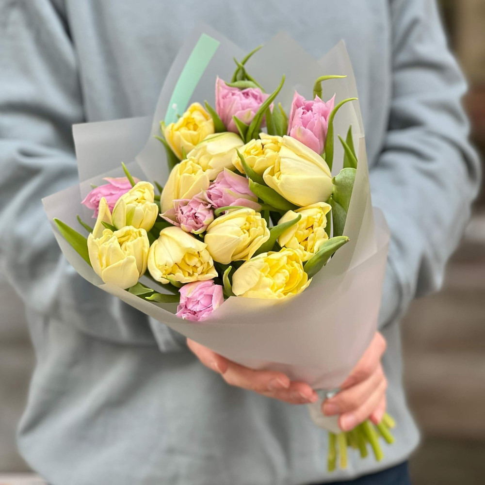 Махрові лимонні та ніжно-бузкові тюльпани – чудовий варіант привітати кохану з початком нового дня.
