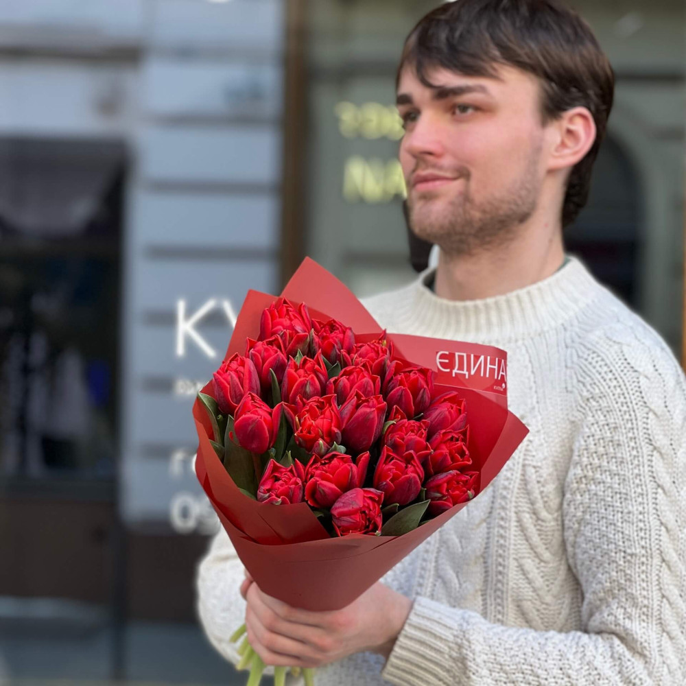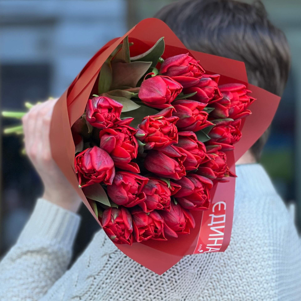 - Як замовити 19 червоних півонієвидних тюльпанів у букеті «Пристрасне вітання»? ❯
