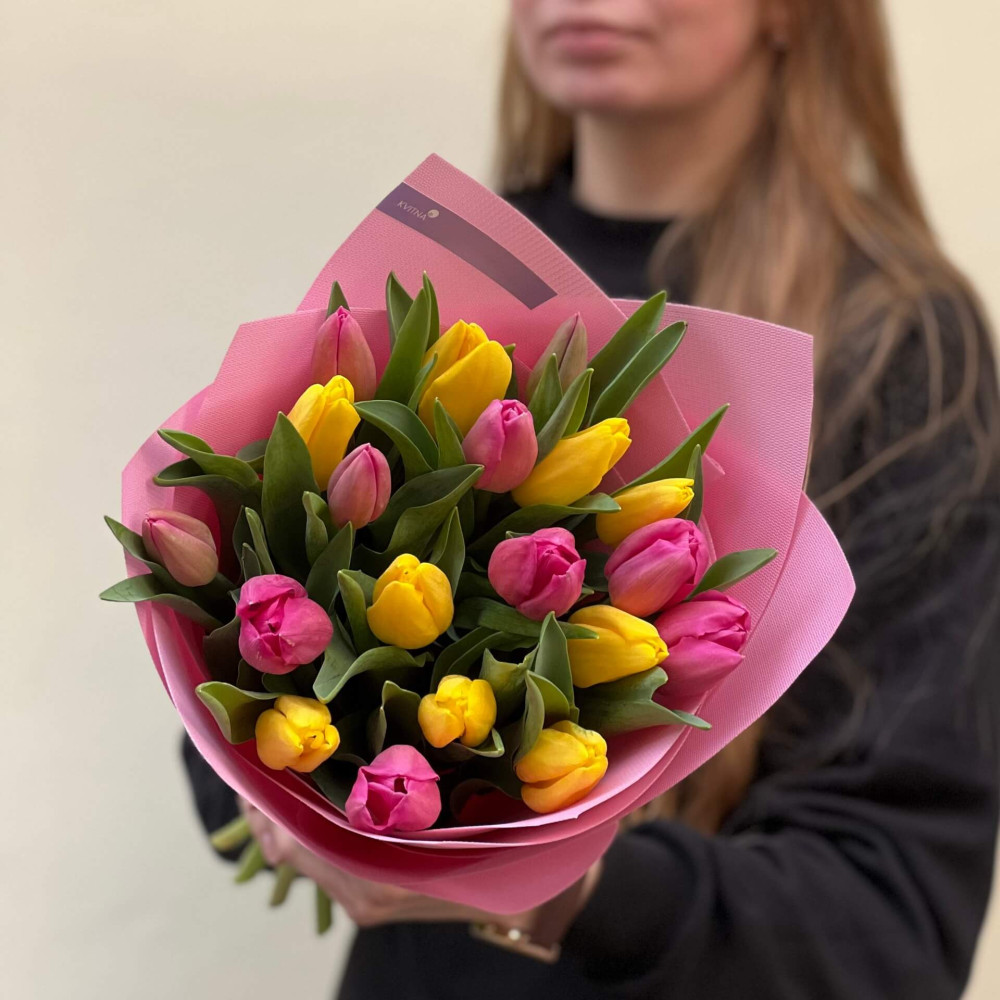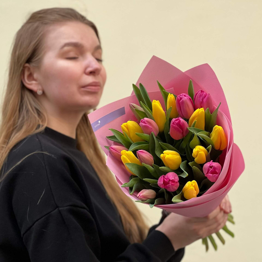 - Як замовити 19 насичених тюльпанів у букеті «Яскраві промінчики»? ❯