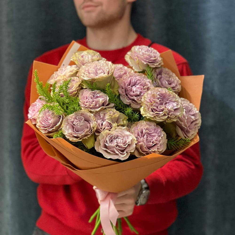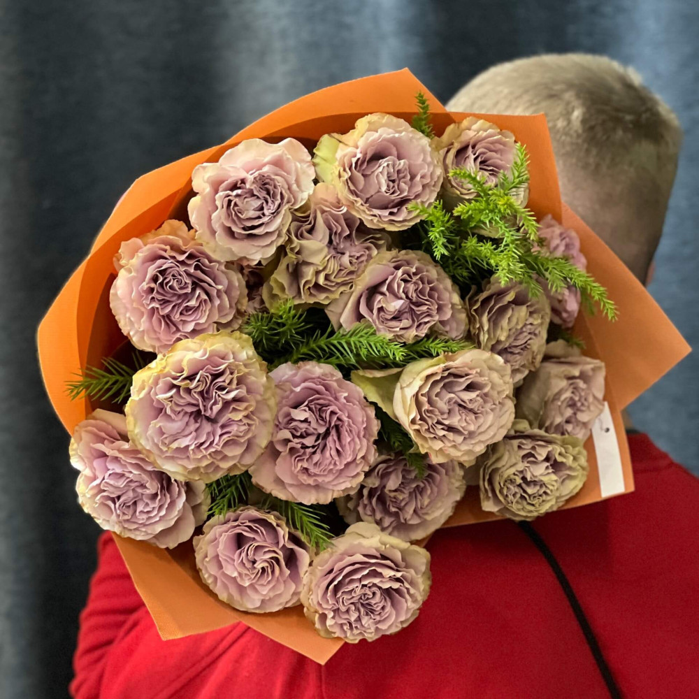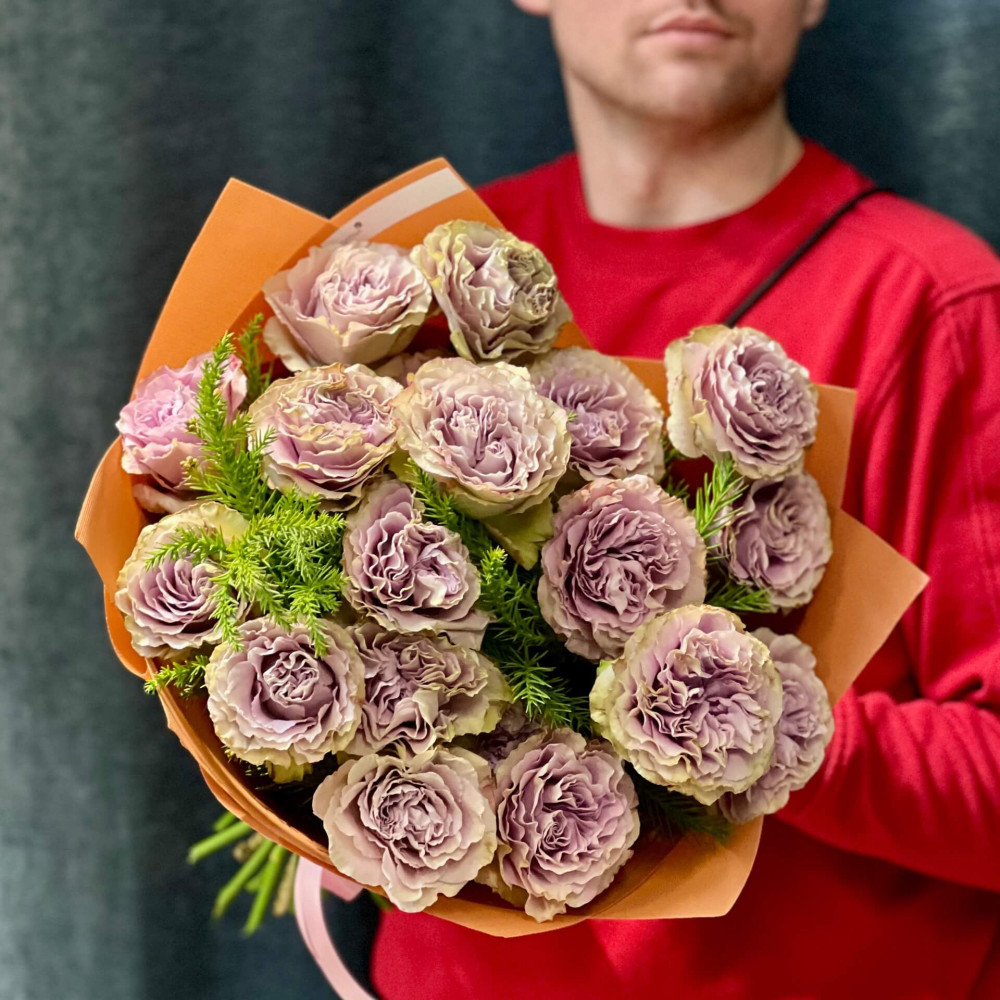 - Як замовити 19 незвичайних півонієвидних троянд Brunia у букеті «Лавандове мереживо»? ❯