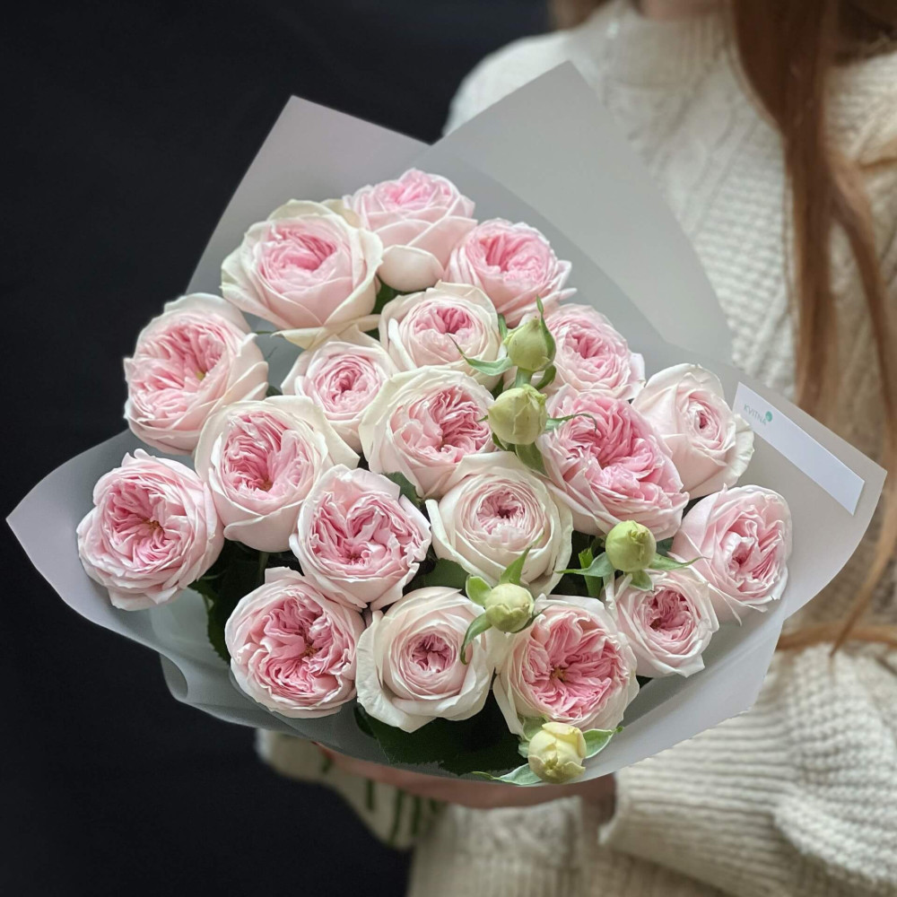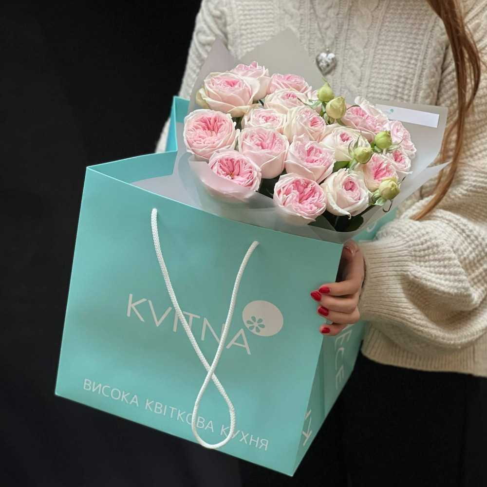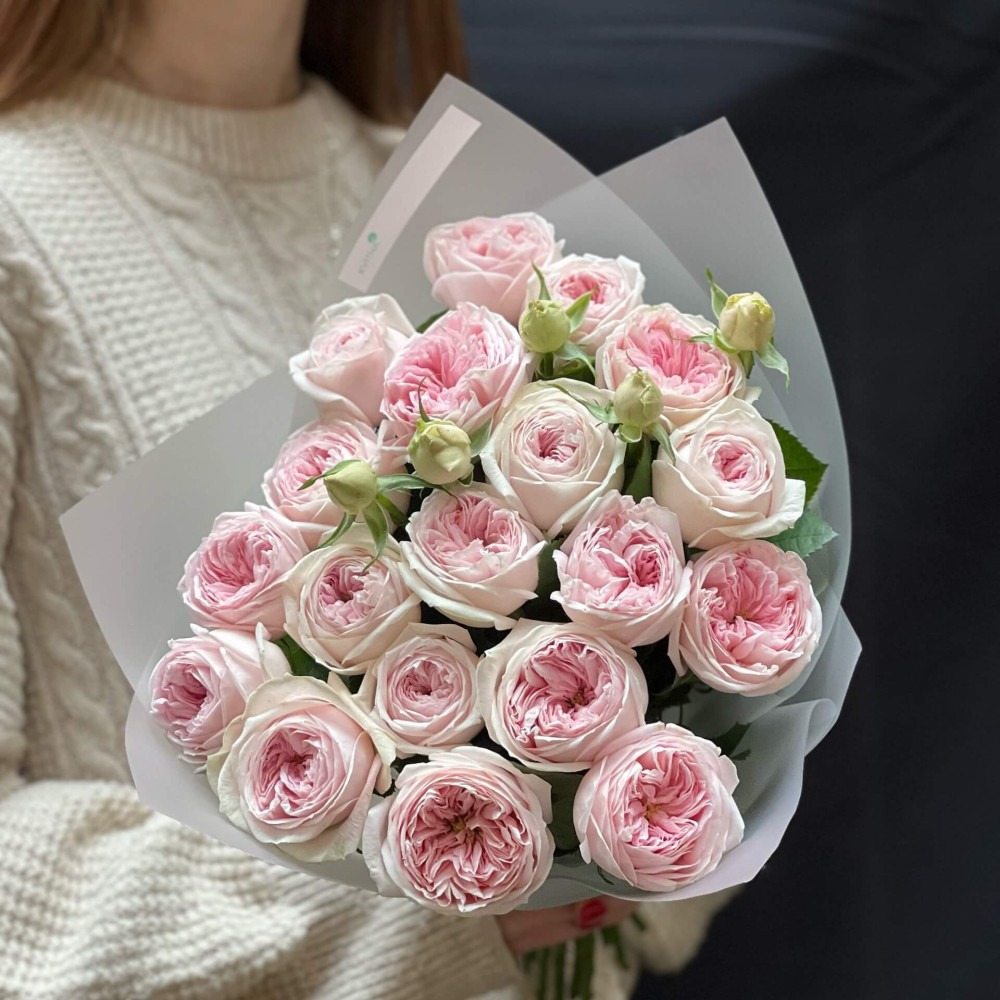 Оберемок витончених півонієподібних троянд так і проситься у вазу в твоєму домі, а їхня рожева пастель гармонуватиме з твоїми світанками.