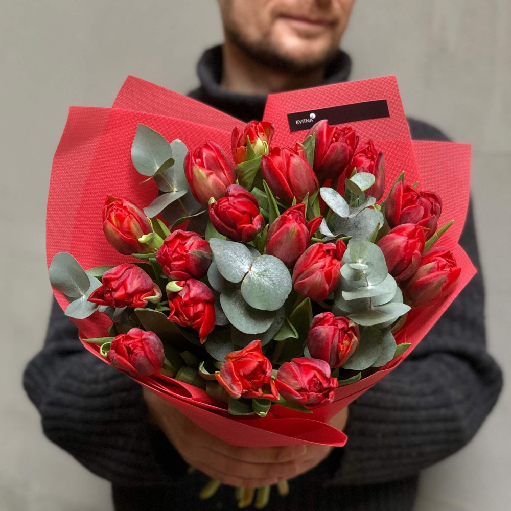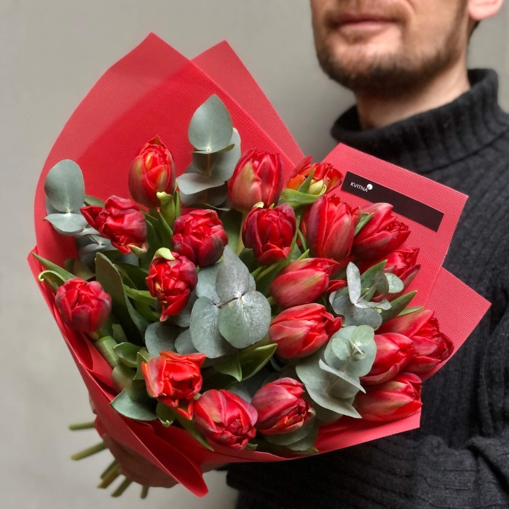 Квіти: Тюльпан піоновидний - 19 шт., Евкаліпт