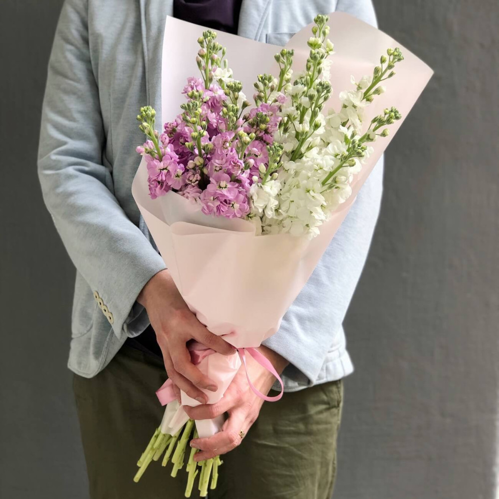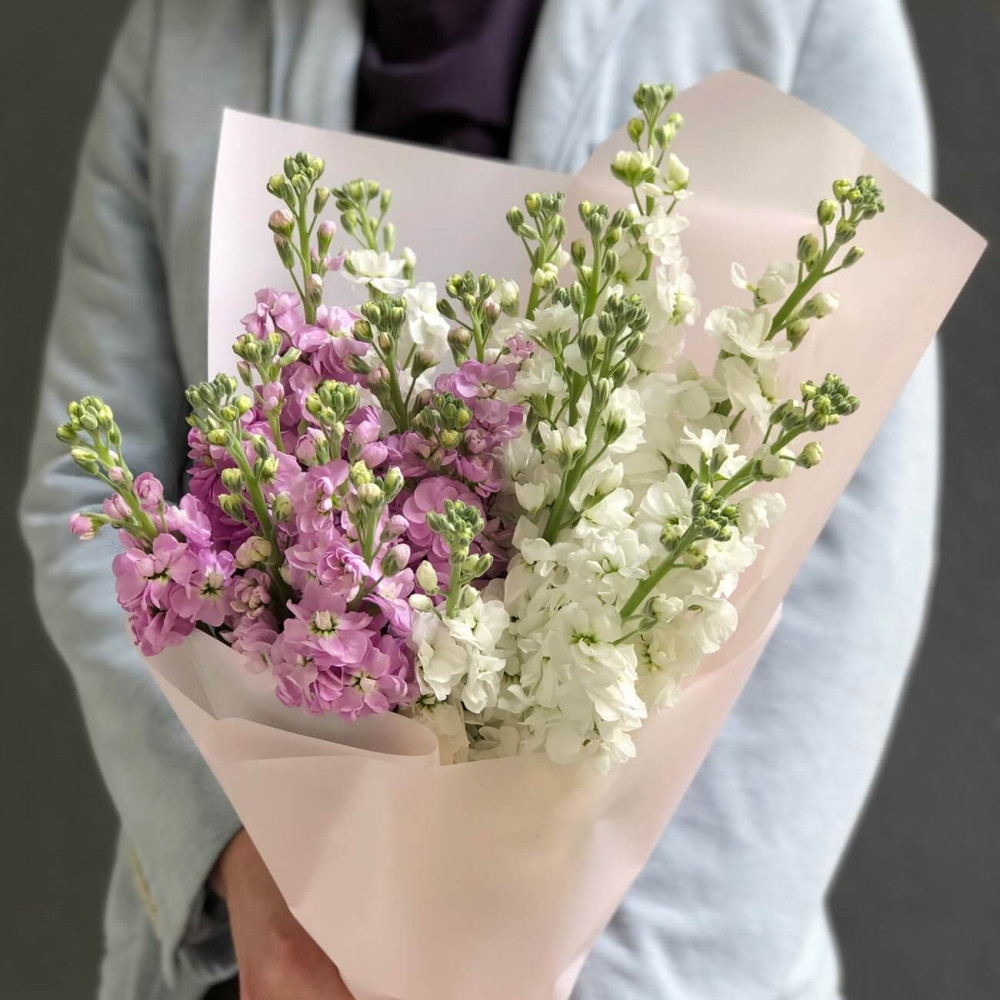 Букет з білої та бузкової матіоли