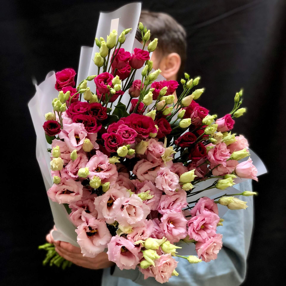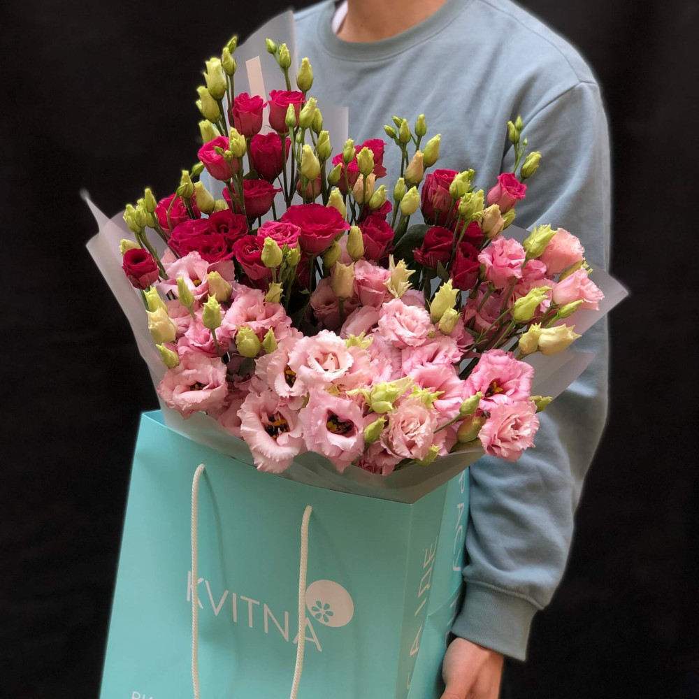 Чудова еустома в кольоровому тандемі, делікатні сатинові пелюсточки нагадують полуничний та смородиновий зефір своїми чистими відтінками. Солодощі, які потішать тебе довго.