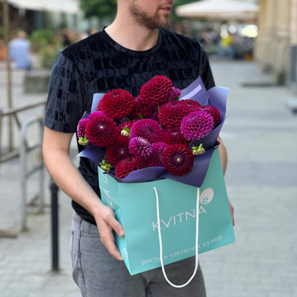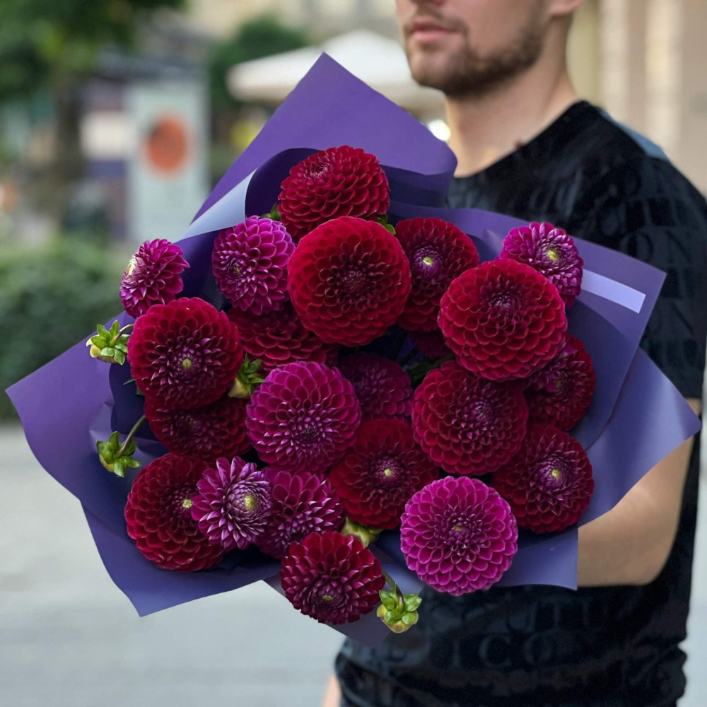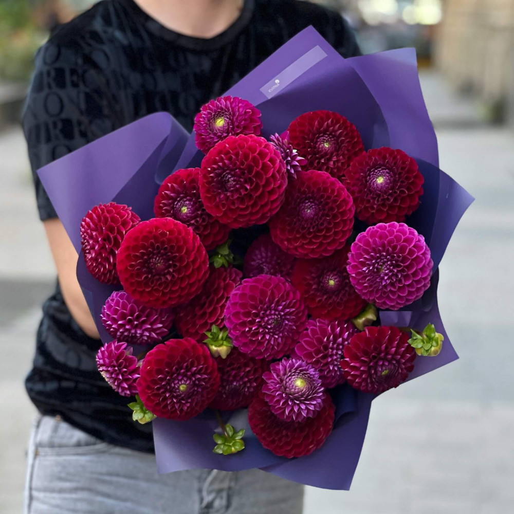 Осінь – царство жоржин. Насичений, глибокого кольору монобукет з чудових сливових та вишневих кульок – немов блискучі окремі намистинки в суплідді достиглої ожини з соковитим смаком та хрумким зернятком всередині.