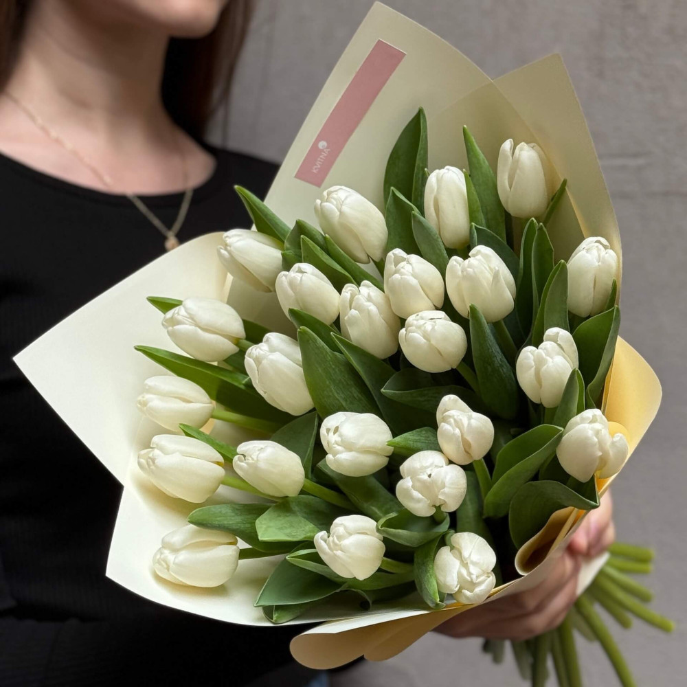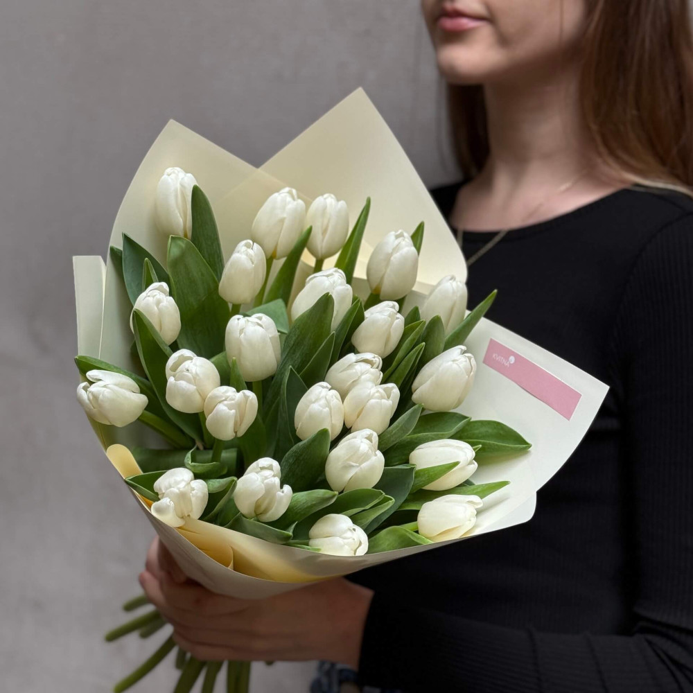 - Як замовити 23 білих тюльпани у букеті «Біла вежа»? ❯