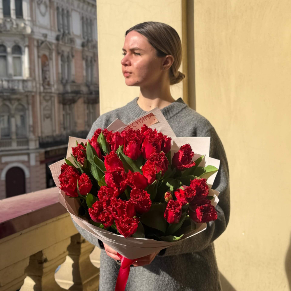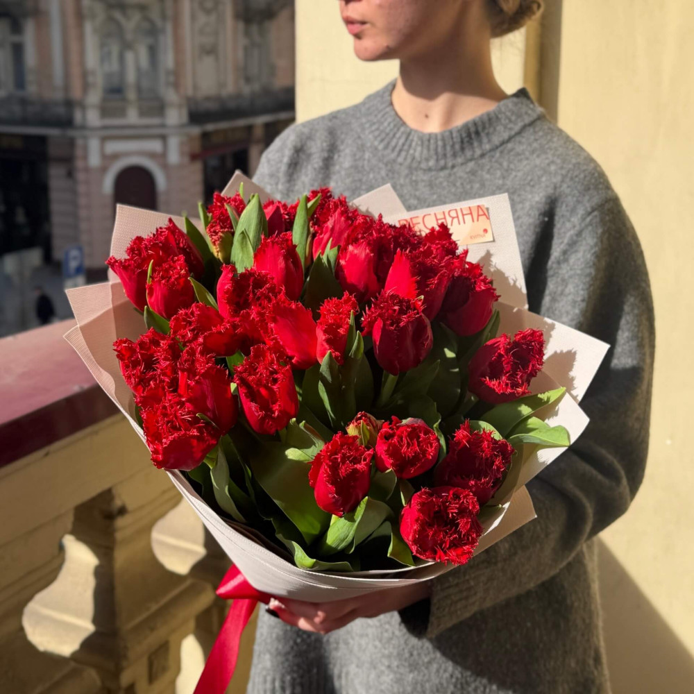 25 бахромчастих тюльпанів у букеті «Червоний промінь»