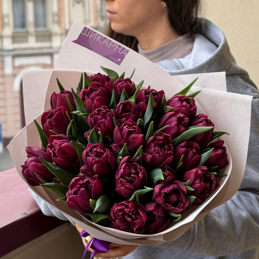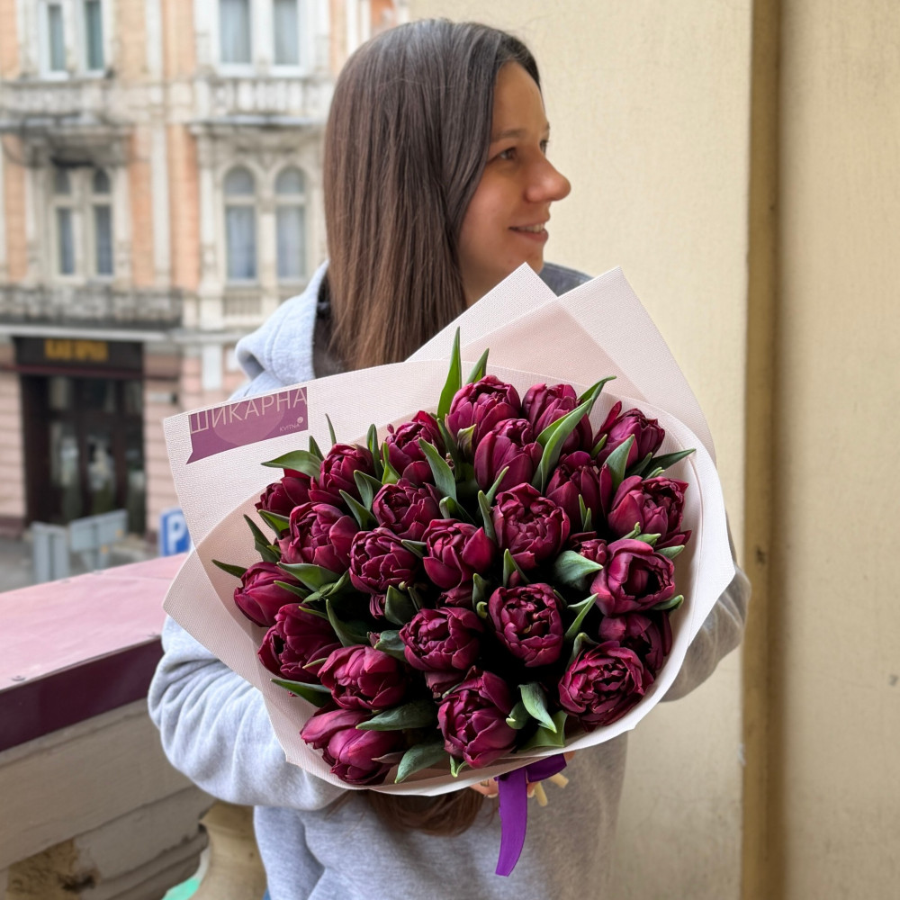 - Як замовити 25 баклажанових піоновидних тюльпанів у букеті «Полум’я в сутінках»? ❯