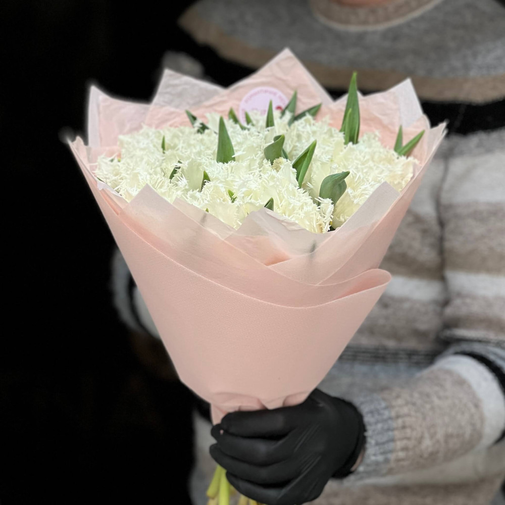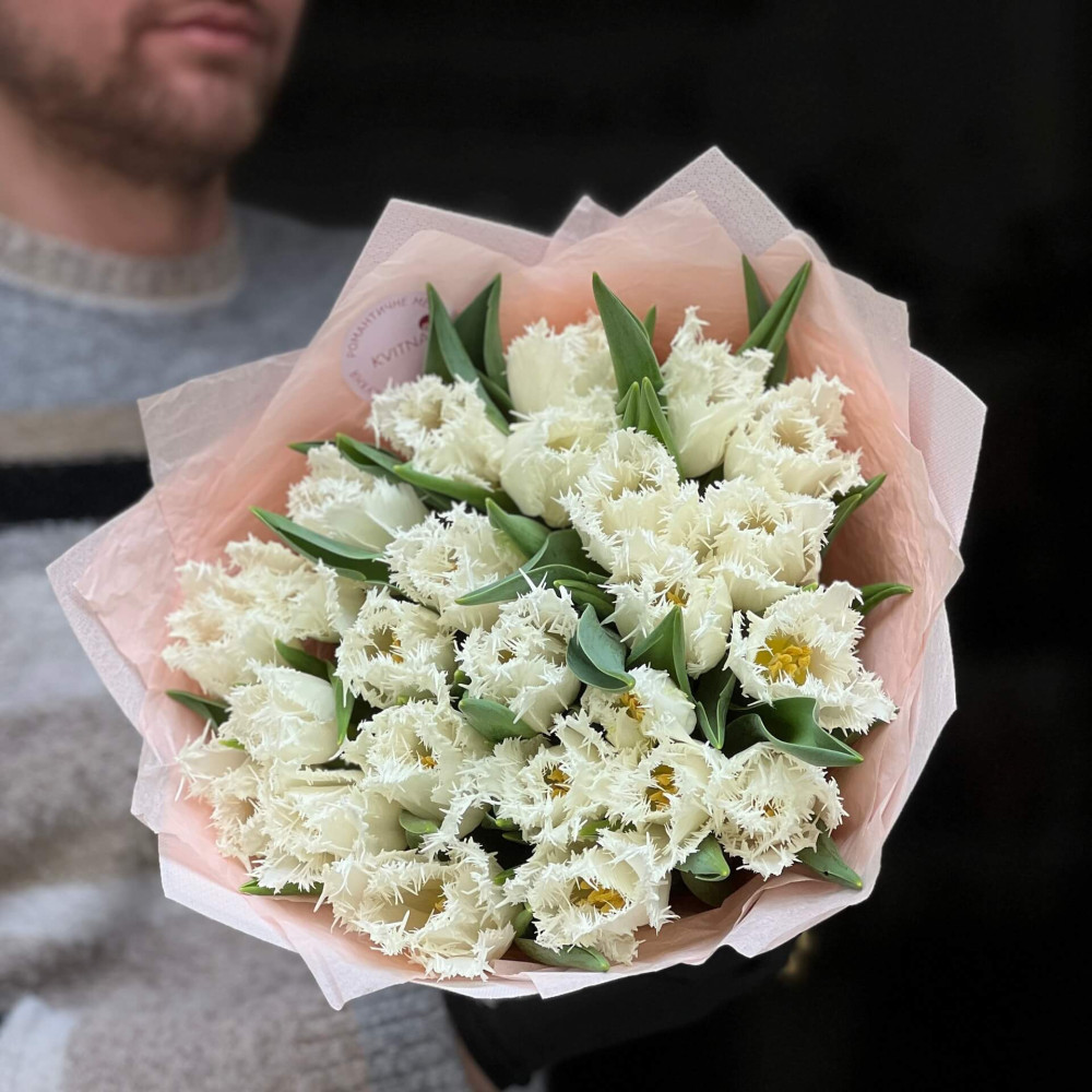 - Як замовити 25 білих бахромчастих тюльпанів сорту Honeymoon у букеті «Мереживна паморозь»? ❯