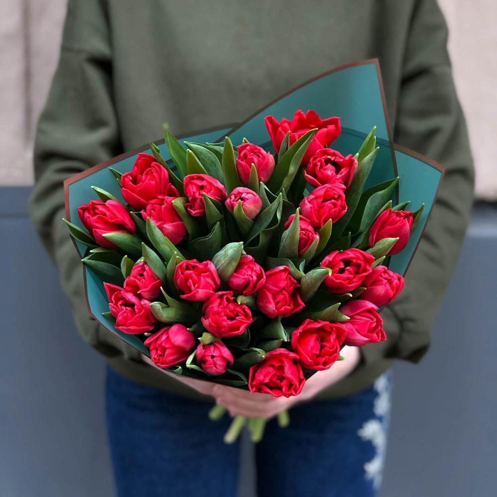 - Як замовити 25 червоних піоновидних тюльпанів? ❯