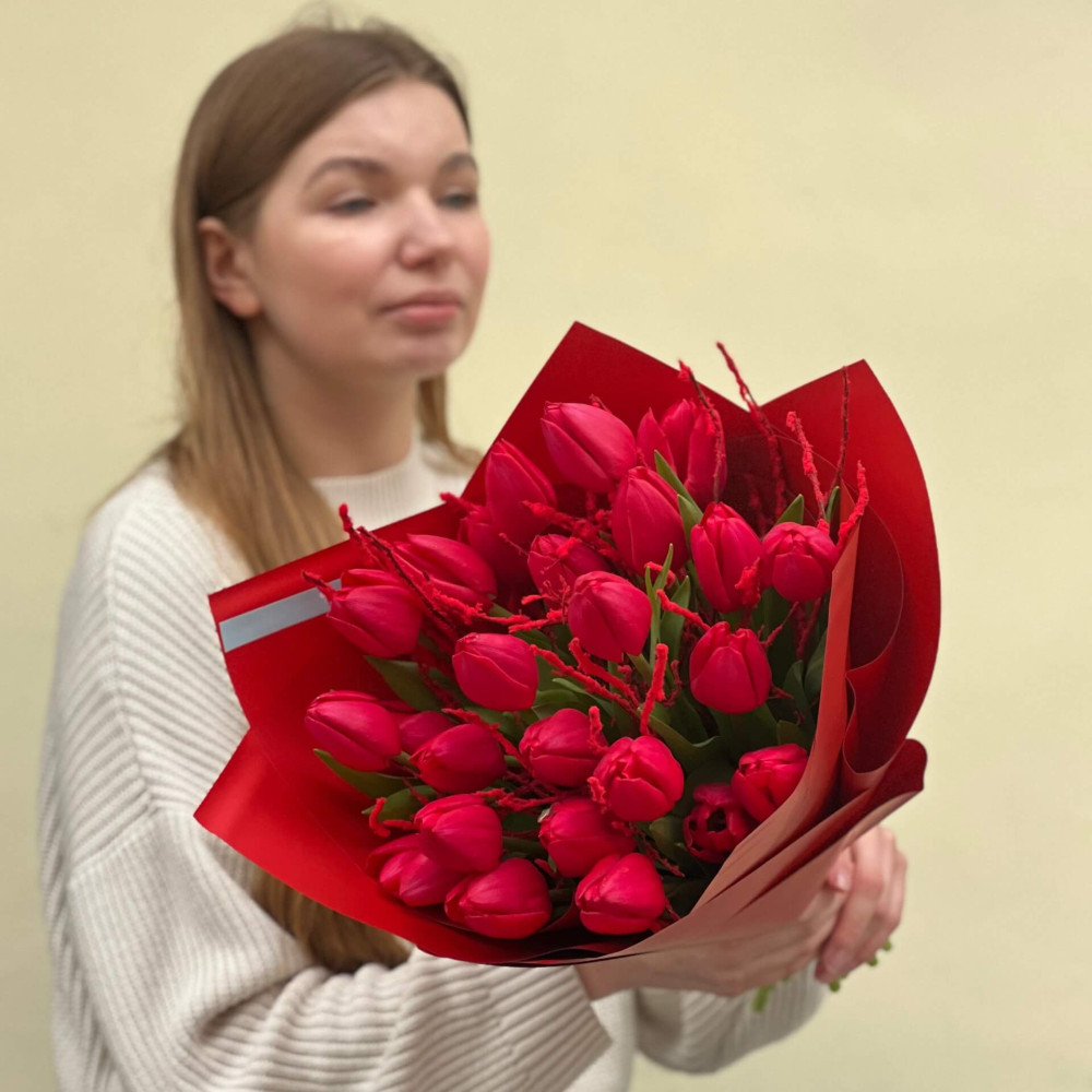 - Як замовити 25 червоних класичних тюльпанів у букеті «Полуничні цукерки»? ❯