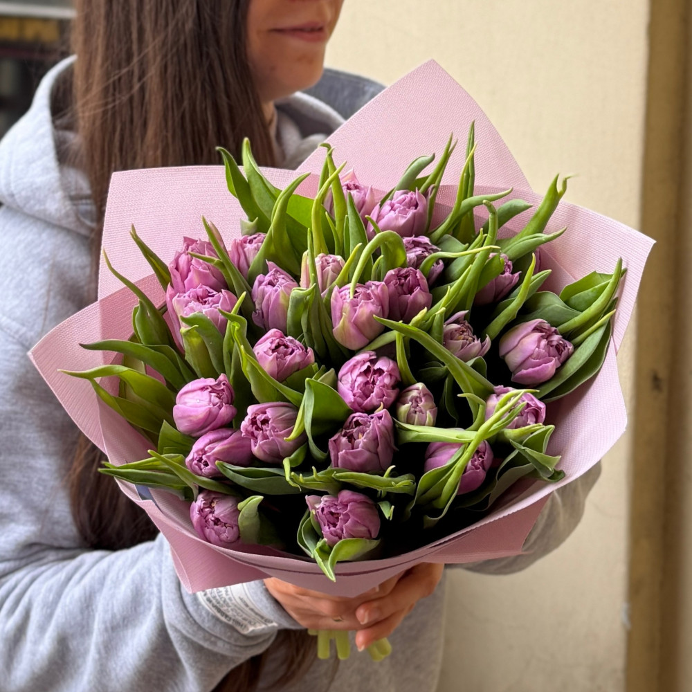 - Як замовити 25 лавандових тюльпанів у букеті «Ніжність»? ❯